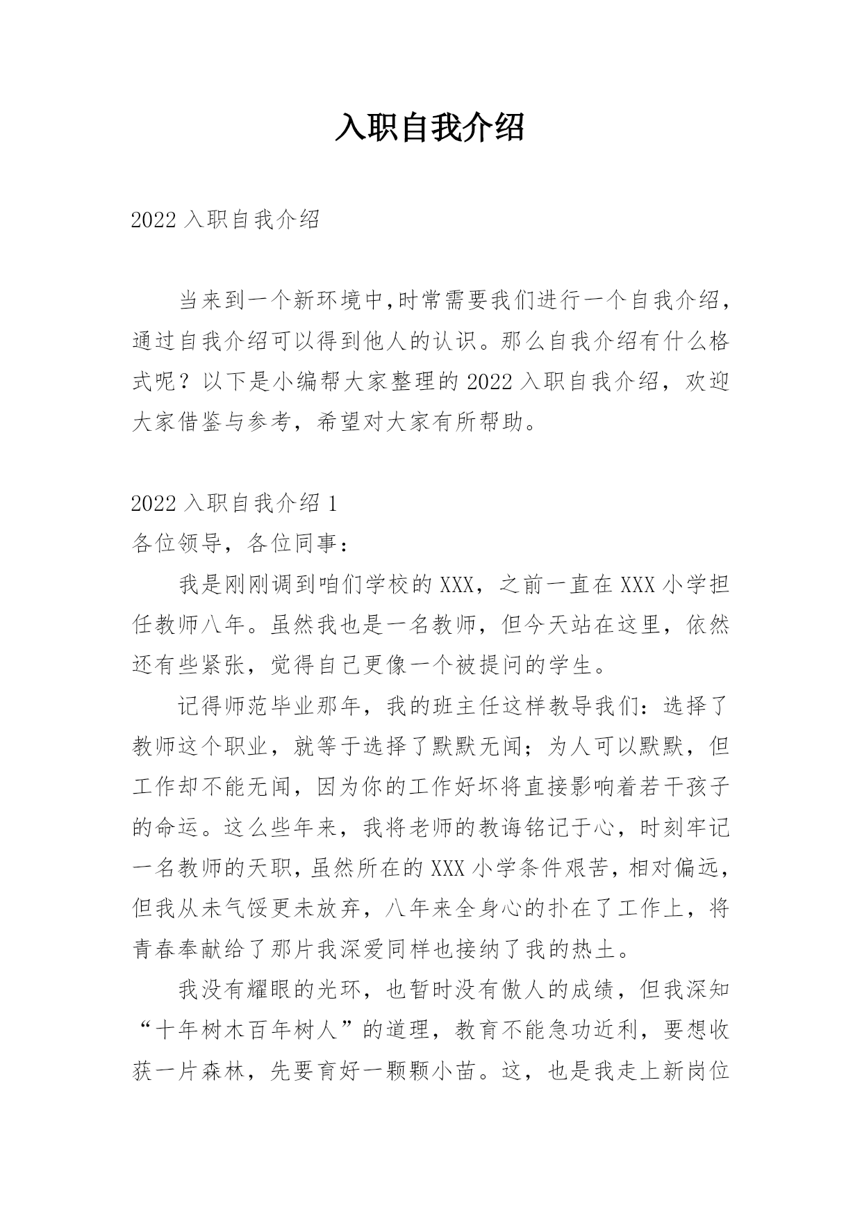 入职自我介绍2022入职自我介绍当来到一个新环境中,时常需要我们进行一个自我介绍,通过自我介绍可以得到他人的认识。那么自我介绍有什么格式呢?以下是小编帮大家整理的2022入职自我介绍,欢迎大家借鉴与参考,希望对大家有所帮助。2022入职自我介绍1各位领导,各位同事:我是刚刚调到咱们学校的XXX,之前一直在XXX小学担任教师八年。虽然我也是一名教师,但今天站在这里,依然还有些紧张,觉得自己更像一个被提问的学生。记得师范毕业那年,我的班主任这样教导我们:选择了教师这个职业,就等于选择了默默无闻;为人可以默默,