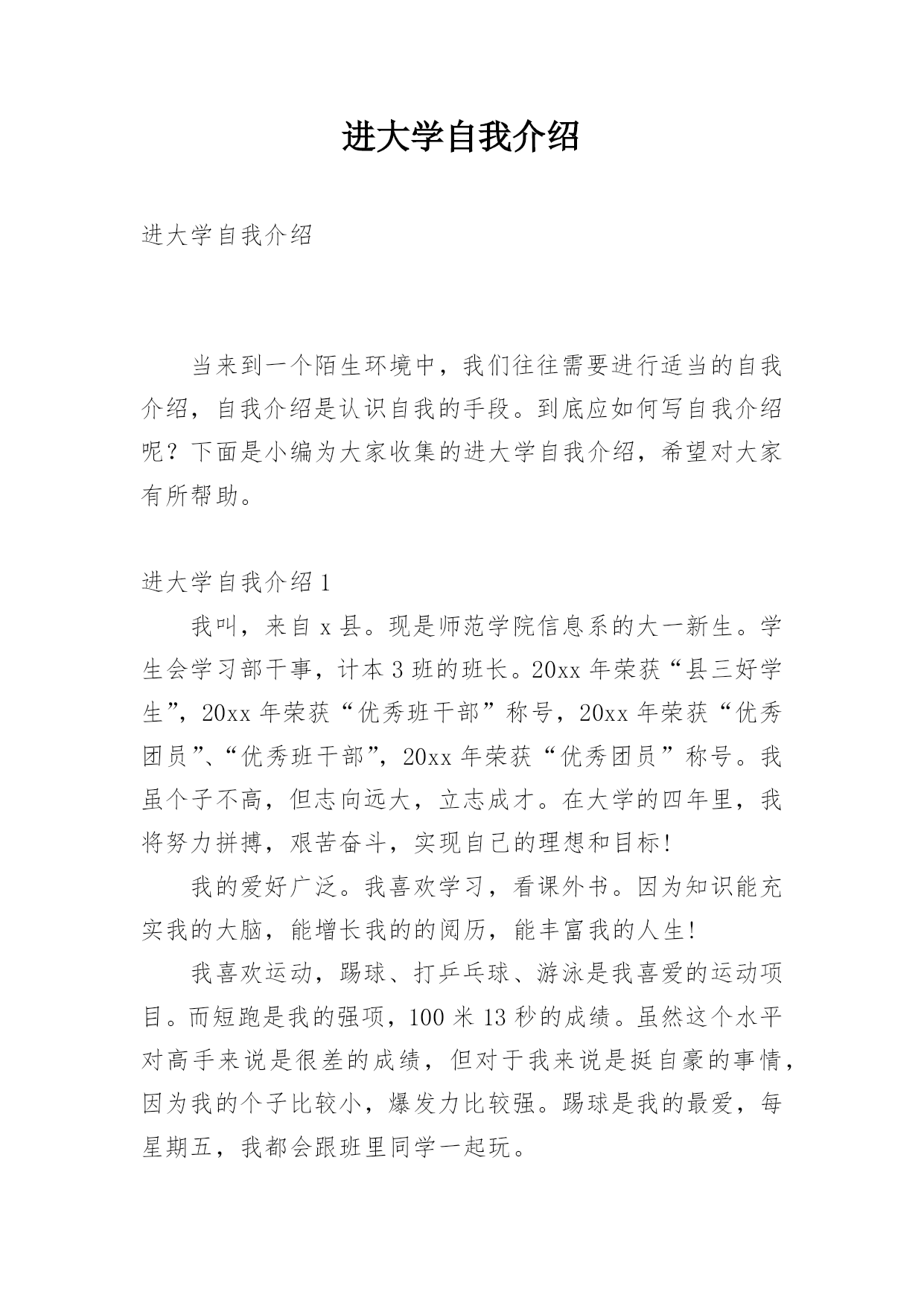 进大学自我介绍进大学自我介绍当来到一个陌生环境中,我们往往需要进行适当的自我介绍,自我介绍是认识自我的手段。到底应如何写自我介绍呢?下面是小编为大家收集的进大学自我介绍,希望对大家有所帮助。进大学自我介绍1我叫,来自x县。现是师范学院信息系的大一新生。学生会学习部干事,计本3班的班长。20xx年荣获“县三好学生”,20xx年荣获“优秀班干部”称号,20xx年荣获“优秀团员”、“优秀班干部”,20xx年荣获“优秀团员”称号。我虽个子不高,但志向远大,立志成才。在大学的四年里,我将努力拼搏,艰苦奋斗,实现自己