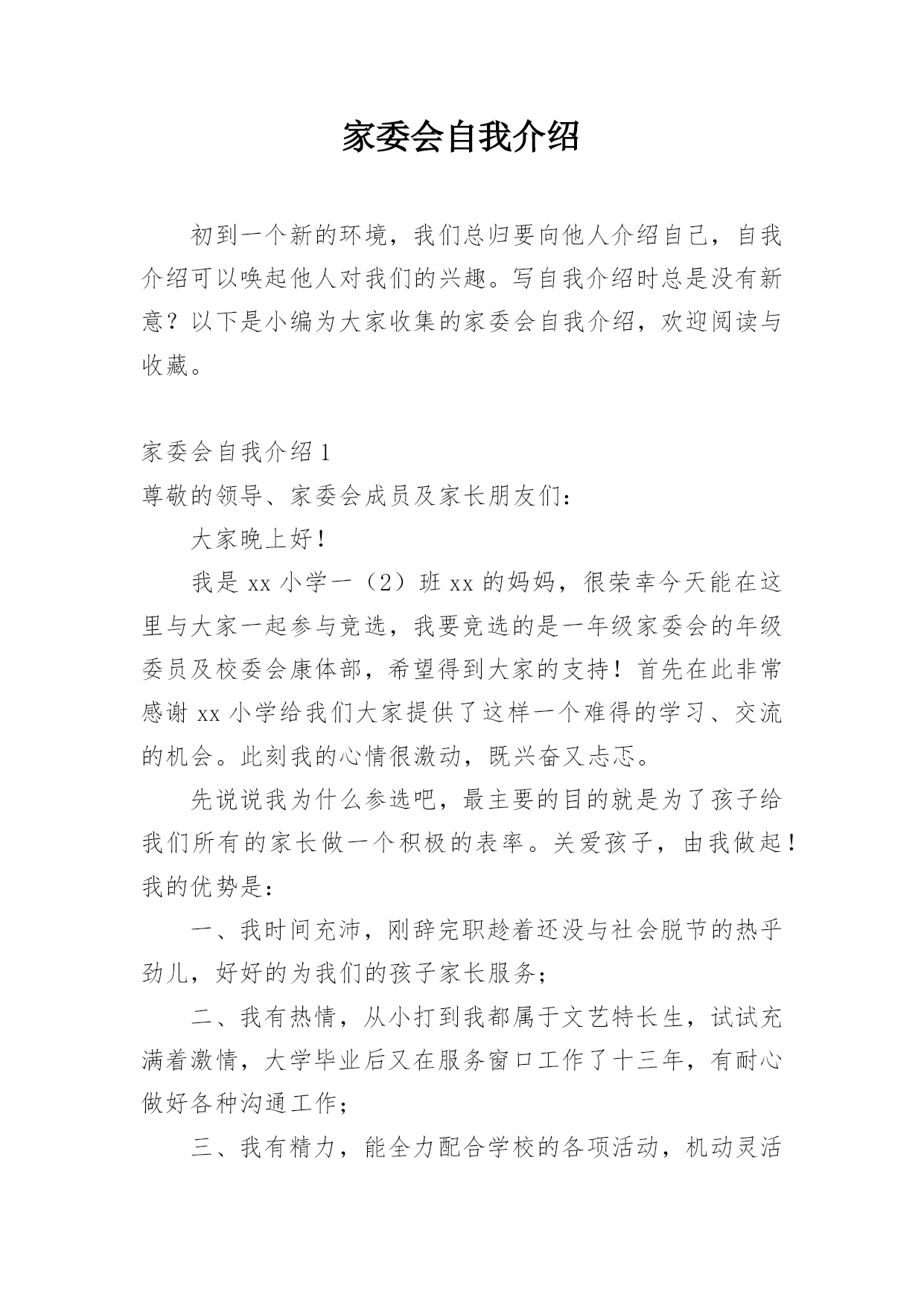 家委会自我介绍初到一个新的环境,我们总归要向他人介绍自己,自我介绍可以唤起他人对我们的兴趣。写自我介绍时总是没有新意?以下是小编为大家收集的家委会自我介绍,欢迎阅读与收藏。家委会自我介绍1尊敬的领导、家委会成员及家长朋友们:大家晚上好!我是xx小学一(2)班xx的妈妈,很荣幸今天能在这里与大家一起参与竞选,我要竞选的是一年级家委会的年级委员及校委会康体部,希望得到大家的支持!首先在此非常感谢xx小学给我们大家提供了这样一个难得的学习、交流的机会。此刻我的心情很激动,既兴奋又忐忑。先说说我为什么参选吧,最主
