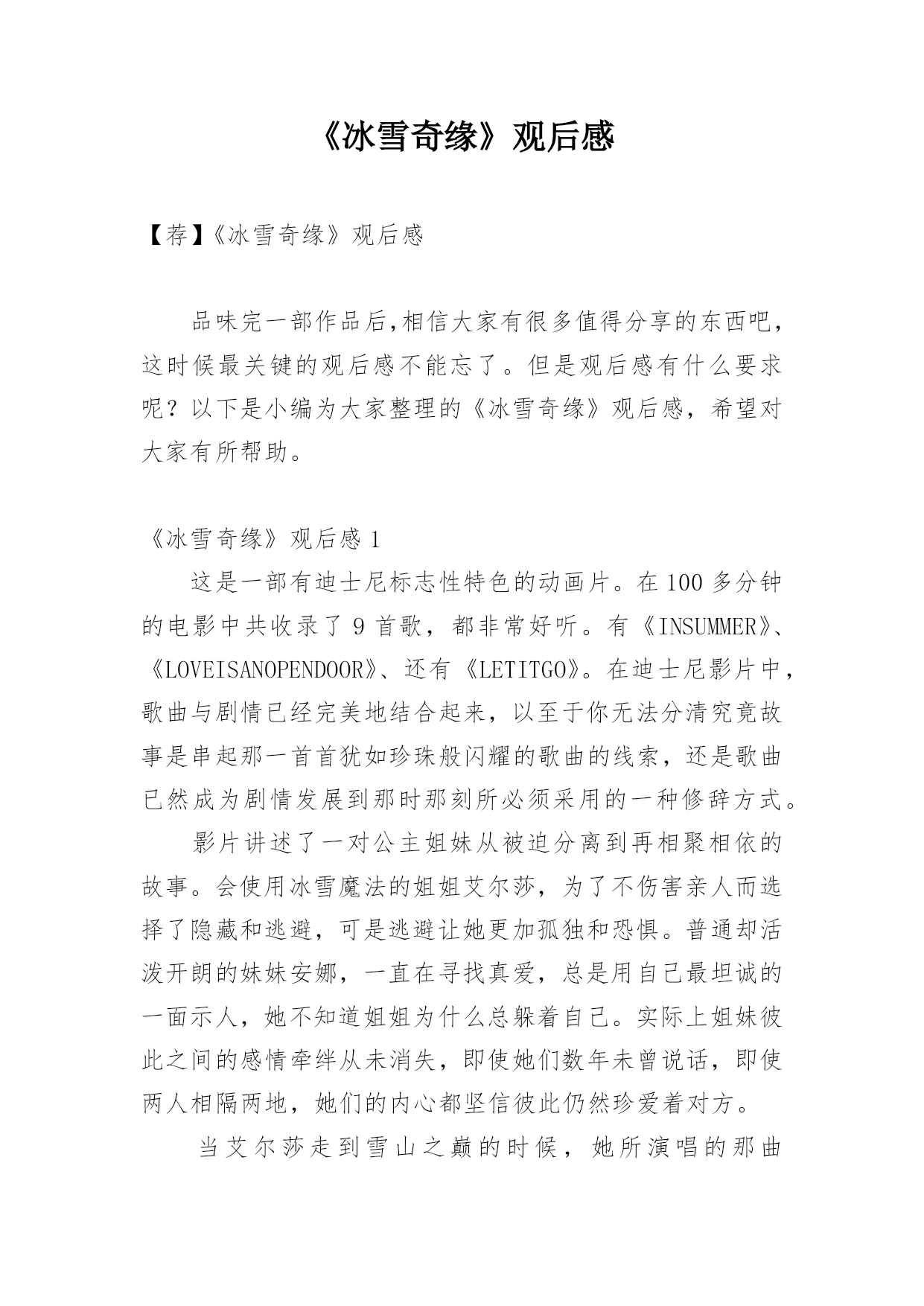 《冰雪奇缘》观后感【荐】《冰雪奇缘》观后感品味完一部作品后,相信大家有很多值得分享的东西吧,这时候最关键的观后感不能忘了。但是观后感有什么要求呢?以下是小编为大家整理的《冰雪奇缘》观后感,希望对大家有所帮助。《冰雪奇缘》观后感1这是一部有迪士尼标志性特色的动画片。在100多分钟的电影中共收录了9首歌,都非常好听。有《INSUMMER》、《LOVEISANOPENDOOR》、还有《LETITGO》。在迪士尼影片中,歌曲与剧情已经完美地结合起来,以至于你无法分清究竟故事是串起那一首首犹如珍珠般闪耀的歌曲的线索