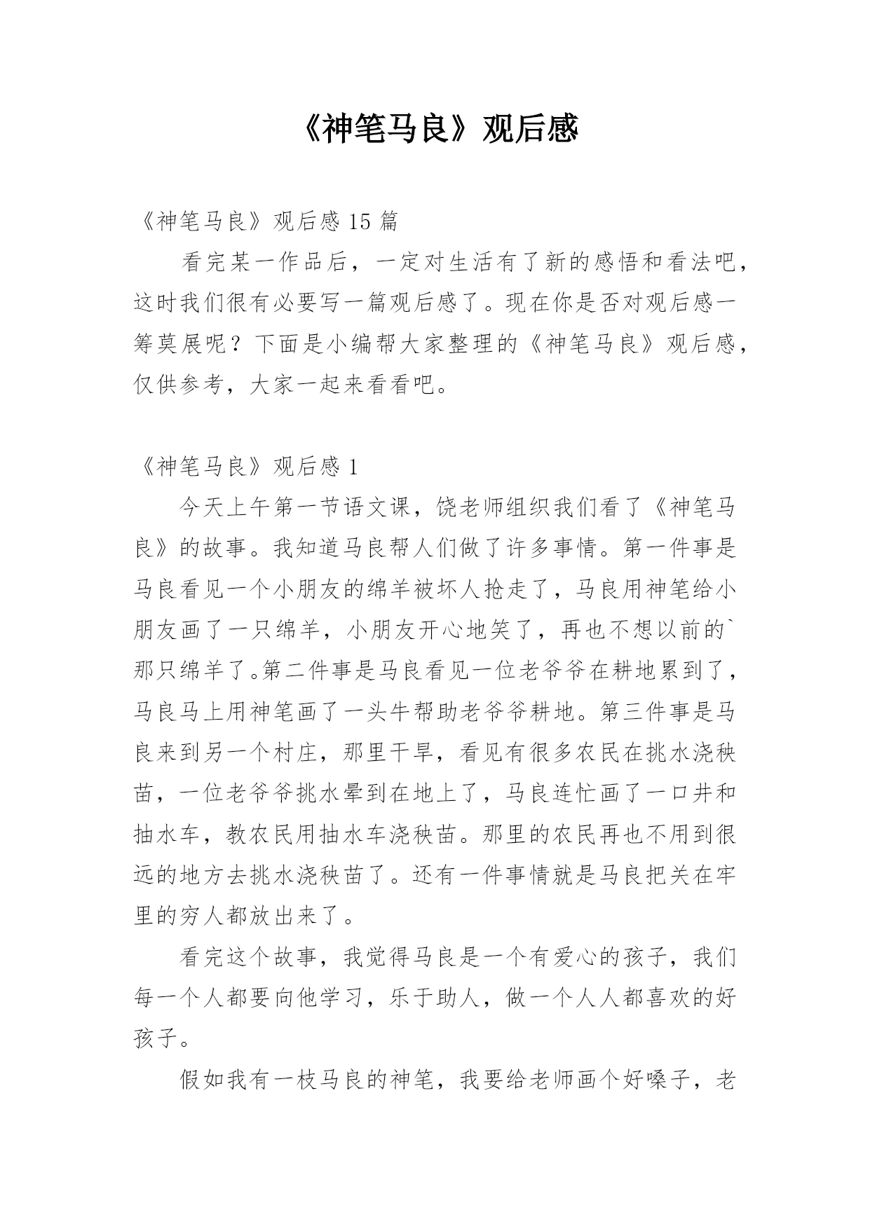 《神笔马良》观后感《神笔马良》观后感15篇看完某一作品后,一定对生活有了新的感悟和看法吧,这时我们很有必要写一篇观后感了。现在你是否对观后感一筹莫展呢?下面是小编帮大家整理的《神笔马良》观后感,仅供参考,大家一起来看看吧。《神笔马良》观后感1今天上午第一节语文课,饶老师组织我们看了《神笔马良》的故事。我知道马良帮人们做了许多事情。第一件事是马良看见一个小朋友的绵羊被坏人抢走了,马良用神笔给小朋友画了一只绵羊,小朋友开心地笑了,再也不想以前的`那只绵羊了。第二件事是马良看见一位老爷爷在耕地累到了,马良马上用