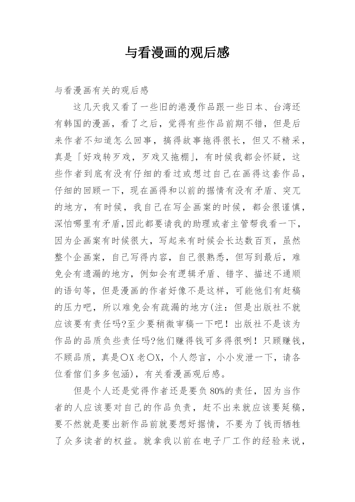 与看漫画的观后感与看漫画有关的观后感这几天我又看了一些旧的港漫作品跟一些日本、台湾还有韩国的漫画,看了之后,觉得有些作品前期不错,但是后来作者不知道怎么回事,搞得故事拖得很长,但又不精采,真是「好戏转歹戏,歹戏又拖棚」,有时候我都会怀疑,这些作者到底有没有仔细的看过或想过自己在画得这套作品,仔细的回顾一下,现在画得和以前的据情有没有矛盾、突兀的地方,有时候,我自己在写企画案的时候,都会很谨慎,深怕哪里有矛盾,因此都要请我的助理或者主管帮我看一下,因为企画案有时候很大,写起来有时候会长达数百页,虽然整个企画