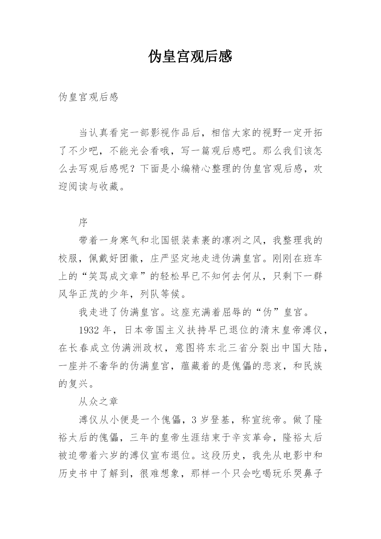 伪皇宫观后感伪皇宫观后感当认真看完一部影视作品后,相信大家的视野一定开拓了不少吧,不能光会看哦,写一篇观后感吧。那么我们该怎么去写观后感呢?下面是小编精心整理的伪皇宫观后感,欢迎阅读与收藏。序带着一身寒气和北国银装素裹的凛冽之风,我整理我的校服,佩戴好团徽,庄严坚定地走进伪满皇宫。刚刚在班车上的“笑骂成文章”的轻松早已不知何去何从,只剩下一群风华正茂的少年,列队等候。我走进了伪满皇宫。这座充满着屈辱的“伪”皇宫。1932年,日本帝国主义扶持早已退位的清末皇帝溥仪,在长春成立伪满洲政权,意图将东北三省分裂出