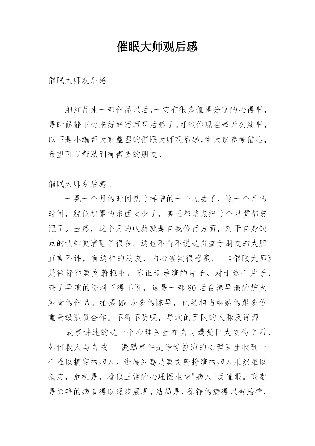 催眠大师观后感催眠大师观后感细细品味一部作品以后,一定有很多值得分享的心得吧,是时候静下心来好好写写观后感了。可能你现在毫无头绪吧,以下是小编帮大家整理的催眠大师观后感,供大家参考借鉴,希望可以帮助到有需要的朋友。催眠大师观后感1一晃一个月的时间就这样噌的一下过去了,这一个月的时间,貌似积累的东西太少了,甚至都差点把这个习惯都忘记了。当然,这个月的收获就是自我修行方面,对于自身缺点的认知更清醒了很多。这也不得不说是得益于朋友的大胆直言不讳,有这样的朋友,内心确实很感激。《催眠大师》是徐铮和莫文蔚担纲,陈正