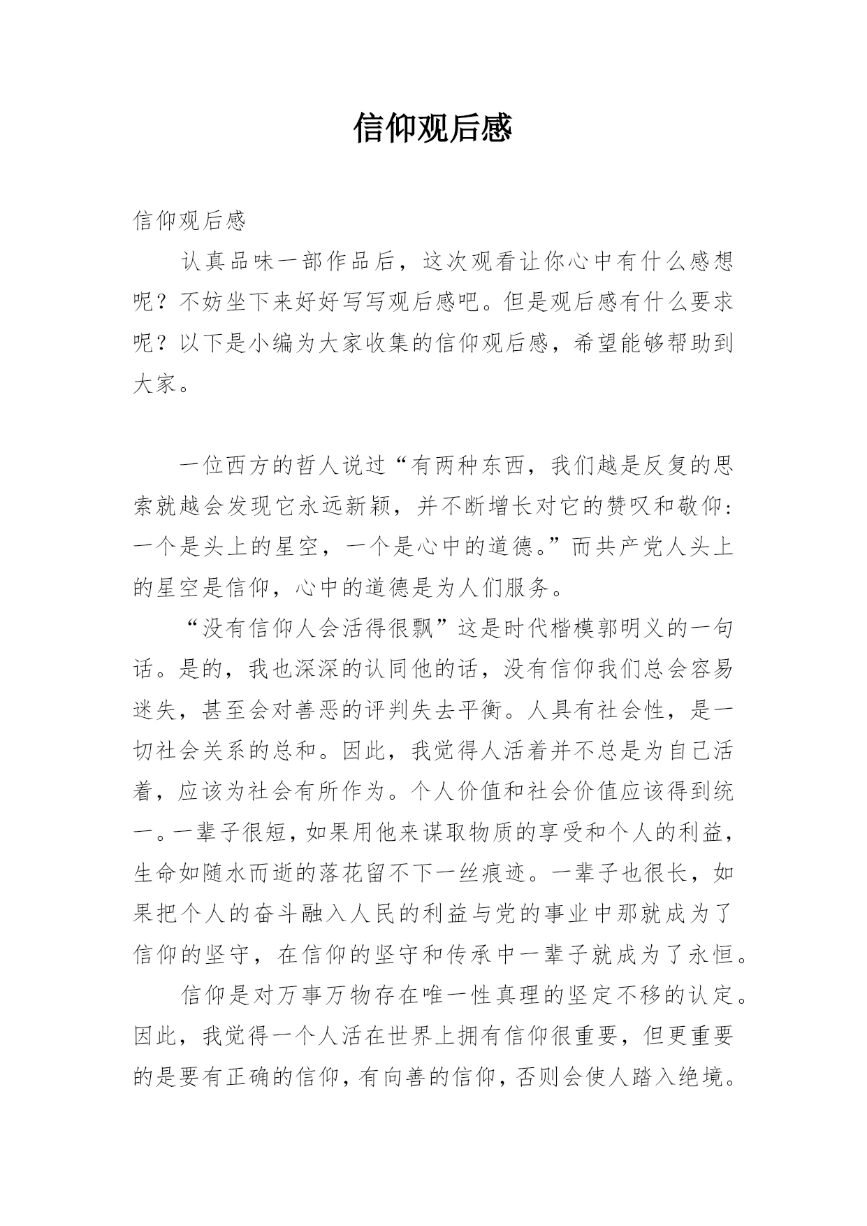 信仰观后感信仰观后感认真品味一部作品后,这次观看让你心中有什么感想呢?不妨坐下来好好写写观后感吧。但是观后感有什么要求呢?以下是小编为大家收集的信仰观后感,希望能够帮助到大家。一位西方的哲人说过“有两种东西,我们越是反复的思索就越会发现它永远新颖,并不断增长对它的赞叹和敬仰:一个是头上的星空,一个是心中的道德。”而共产党人头上的星空是信仰,心中的道德是为人们服务。“没有信仰人会活得很飘”这是时代楷模郭明义的一句话。是的,我也深深的认同他的话,没有信仰我们总会容易迷失,甚至会对善恶的评判失去平衡。人具有社会
