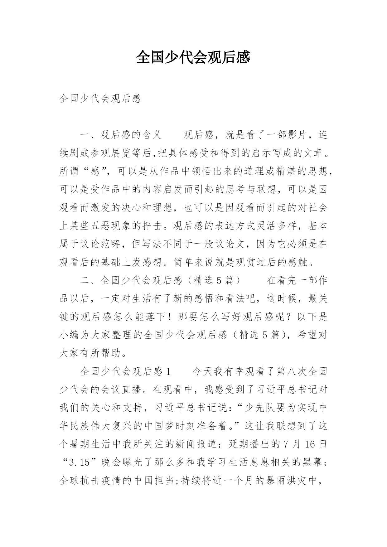 全国少代会观后感全国少代会观后感一、观后感的含义观后感,就是看了一部影片,连续剧或参观展览等后,把具体感受和得到的启示写成的文章。所谓“感”,可以是从作品中领悟出来的道理或精湛的思想,可以是受作品中的内容启发而引起的思考与联想,可以是因观看而激发的决心和理想,也可以是因观看而引起的对社会上某些丑恶现象的抨击。观后感的表达方式灵活多样,基本属于议论范畴,但写法不同于一般议论文,因为它必须是在观看后的基础上发感想。简单来说就是观赏过后的感触。二、全国少代会观后感(精选5篇)在看完一部作品以后,一定对生活有了新