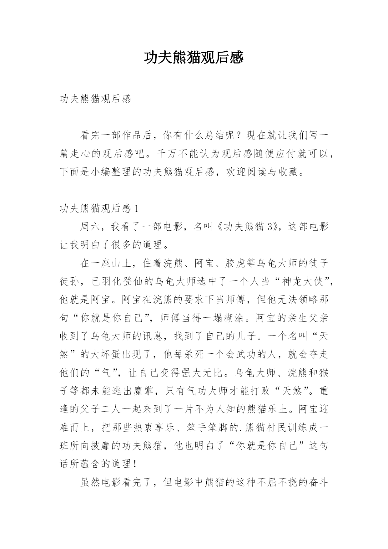功夫熊猫观后感功夫熊猫观后感看完一部作品后,你有什么总结呢?现在就让我们写一篇走心的观后感吧。千万不能认为观后感随便应付就可以,下面是小编整理的功夫熊猫观后感,欢迎阅读与收藏。功夫熊猫观后感1周六,我看了一部电影,名叫《功夫熊猫3》,这部电影让我明白了很多的道理。在一座山上,住着浣熊、阿宝、胶虎等乌龟大师的徒子徒孙,已羽化登仙的乌龟大师选中了一个人当“神龙大侠”,他就是阿宝。阿宝在浣熊的要求下当师傅,但他无法领略那句“你就是你自己”,师傅当得一塌糊涂。阿宝的亲生父亲收到了乌龟大师的讯息,找到了自己的儿子。