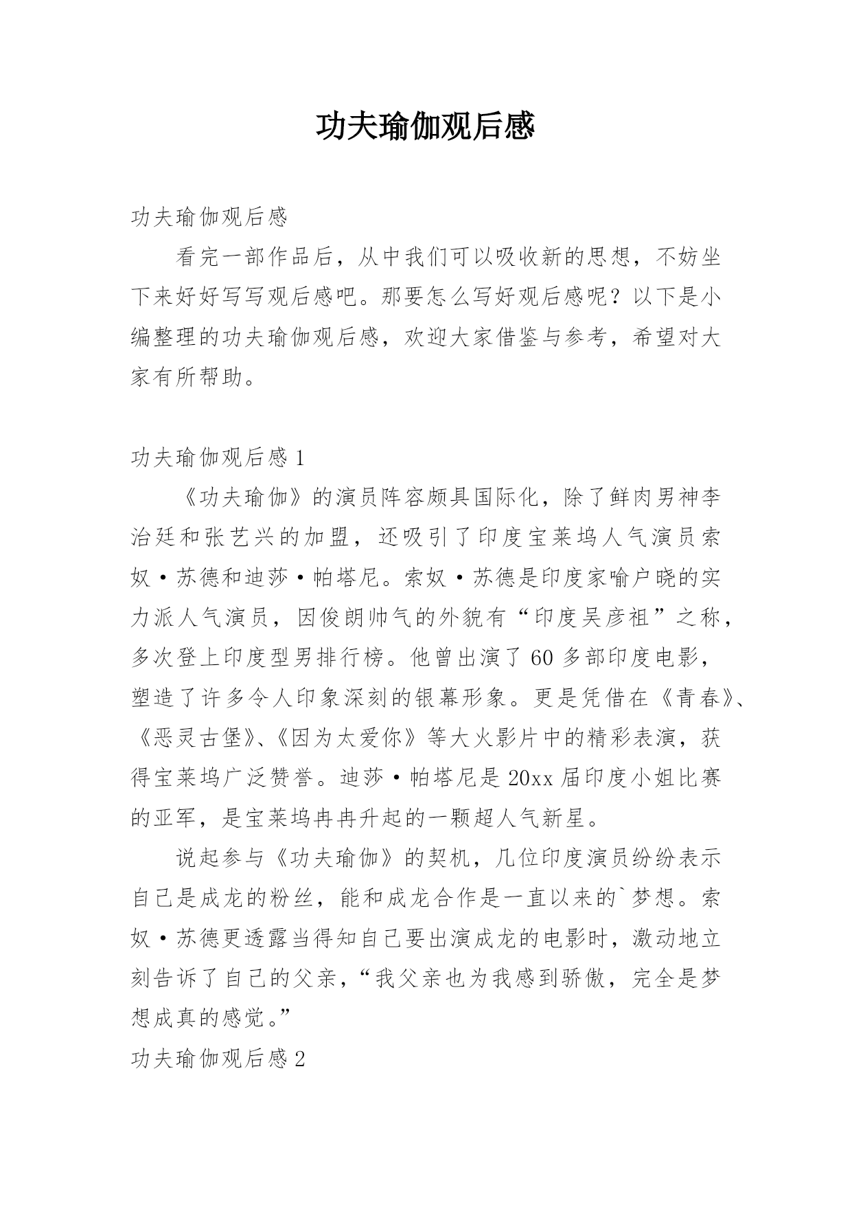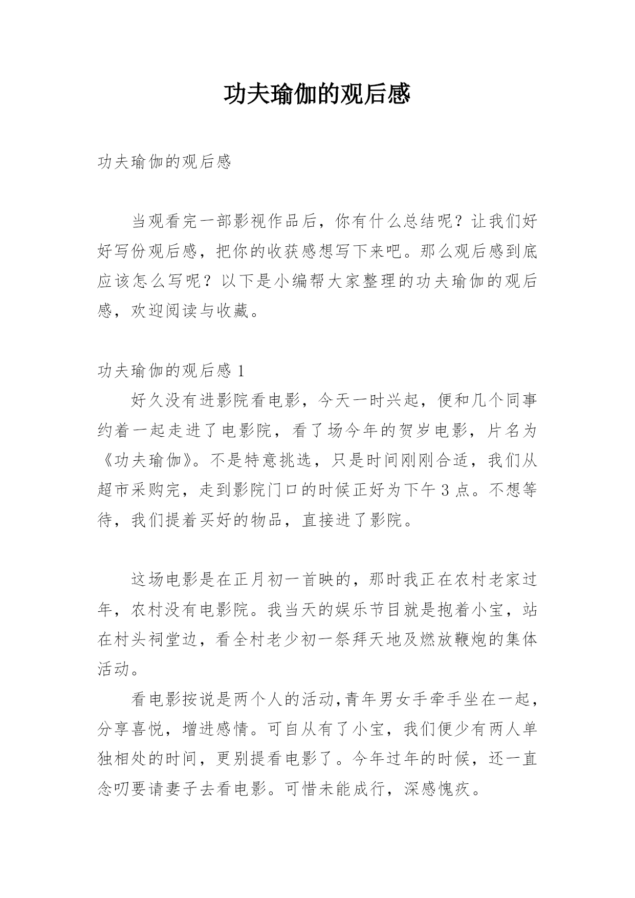 功夫瑜伽的观后感功夫瑜伽的观后感当观看完一部影视作品后,你有什么总结呢?让我们好好写份观后感,把你的收获感想写下来吧。那么观后感到底应该怎么写呢?以下是小编帮大家整理的功夫瑜伽的观后感,欢迎阅读与收藏。功夫瑜伽的观后感1好久没有进影院看电影,今天一时兴起,便和几个同事约着一起走进了电影院,看了场今年的贺岁电影,片名为《功夫瑜伽》。不是特意挑选,只是时间刚刚合适,我们从超市采购完,走到影院门口的时候正好为下午3点。不想等待,我们提着买好的物品,直接进了影院。这场电影是在正月初一首映的,那时我正在农村老家过年