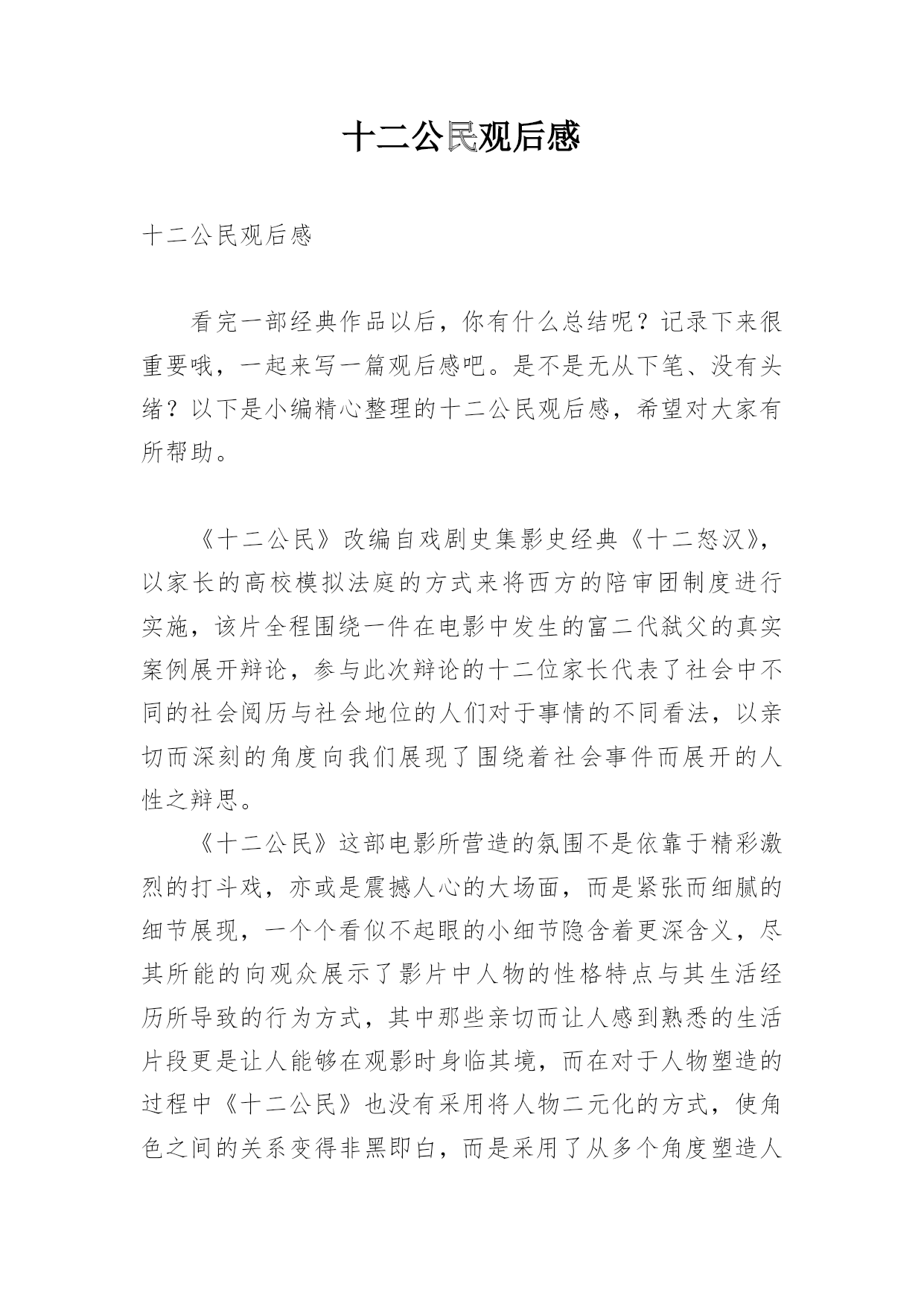 十二公民观后感十二公民观后感看完一部经典作品以后,你有什么总结呢?记录下来很重要哦,一起来写一篇观后感吧。是不是无从下笔、没有头绪?以下是小编精心整理的十二公民观后感,希望对大家有所帮助。《十二公民》改编自戏剧史集影史经典《十二怒汉》,以家长的高校模拟法庭的方式来将西方的陪审团制度进行实施,该片全程围绕一件在电影中发生的富二代弑父的真实案例展开辩论,参与此次辩论的十二位家长代表了社会中不同的社会阅历与社会地位的人们对于事情的不同看法,以亲切而深刻的角度向我们展现了围绕着社会事件而展开的人性之辩思。《十二公