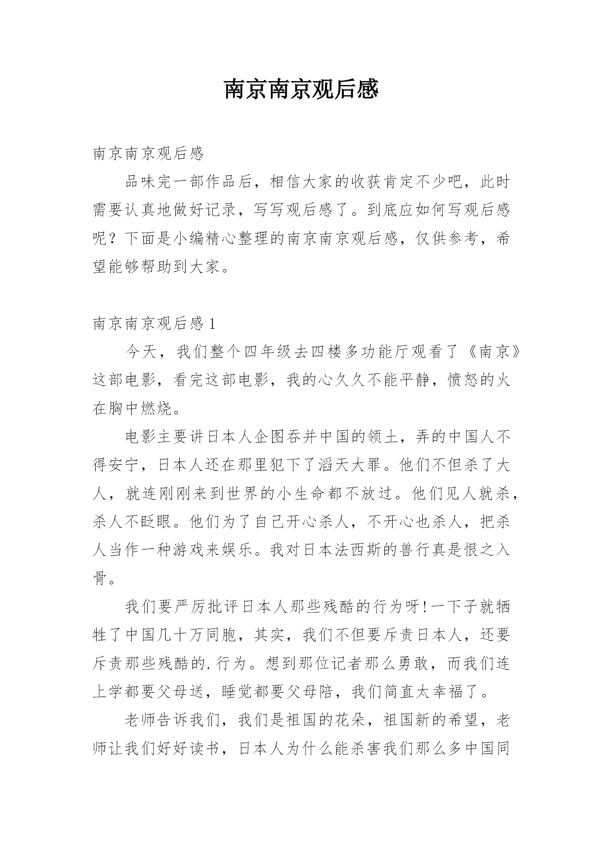 南京南京观后感南京南京观后感品味完一部作品后,相信大家的收获肯定不少吧,此时需要认真地做好记录,写写观后感了。到底应如何写观后感呢?下面是小编精心整理的南京南京观后感,仅供参考,希望能够帮助到大家。南京南京观后感1今天,我们整个四年级去四楼多功能厅观看了《南京》这部电影,看完这部电影,我的心久久不能平静,愤怒的火在胸中燃烧。电影主要讲日本人企图吞并中国的领土,弄的中国人不得安宁,日本人还在那里犯下了滔天大罪。他们不但杀了大人,就连刚刚来到世界的小生命都不放过。他们见人就杀,杀人不眨眼。他们为了自己开心杀人