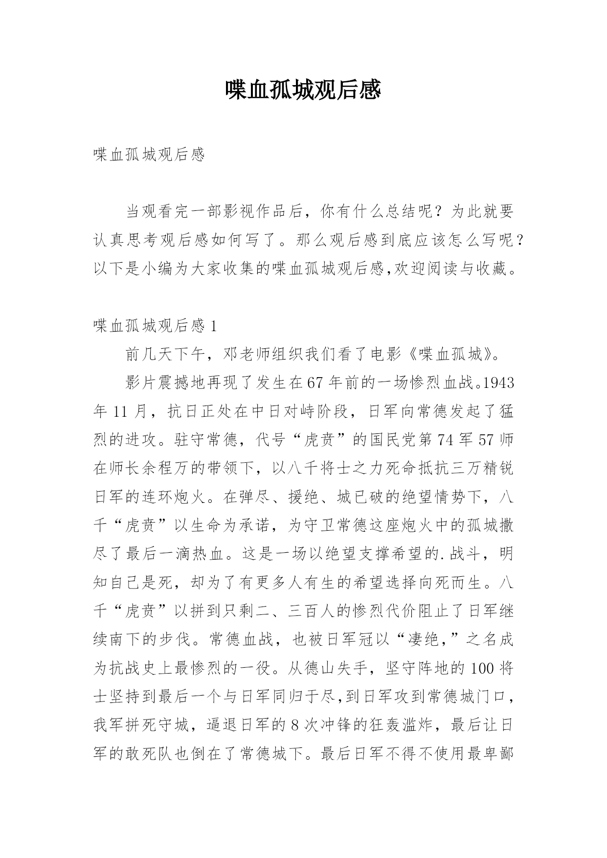喋血孤城观后感喋血孤城观后感当观看完一部影视作品后,你有什么总结呢?为此就要认真思考观后感如何写了。那么观后感到底应该怎么写呢?以下是小编为大家收集的喋血孤城观后感,欢迎阅读与收藏。喋血孤城观后感1前几天下午,邓老师组织我们看了电影《喋血孤城》。影片震撼地再现了发生在67年前的一场惨烈血战。1943年11月,抗日正处在中日对峙阶段,日军向常德发起了猛烈的进攻。驻守常德,代号“虎贲”的国民党第74军57师在师长余程万的带领下,以八千将士之力死命抵抗三万精锐日军的连环炮火。在弹尽、援绝、城已破的绝望情势下,八