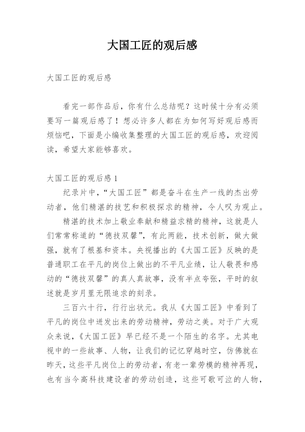大国工匠的观后感大国工匠的观后感看完一部作品后,你有什么总结呢?这时候十分有必须要写一篇观后感了!想必许多人都在为如何写好观后感而烦恼吧,下面是小编收集整理的大国工匠的观后感,欢迎阅读,希望大家能够喜欢。大国工匠的观后感1纪录片中,“大国工匠”都是奋斗在生产一线的杰出劳动者,他们精湛的技艺和积极探求的精神,令人叹为观止。精湛的技术加上敬业奉献和精益求精的精神,这就是人们常常称道的“德技双馨”,有此两能,技术创新,做大做强,就有了根基和资本。央视播出的《大国工匠》反映的是普通职工在平凡的岗位上做出的不平凡业
