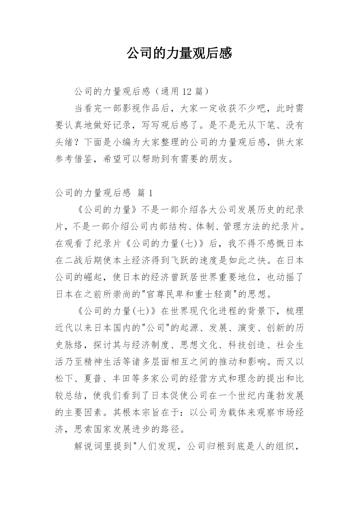 公司的力量观后感公司的力量观后感(通用12篇)当看完一部影视作品后,大家一定收获不少吧,此时需要认真地做好记录,写写观后感了。是不是无从下笔、没有头绪?下面是小编为大家整理的公司的力量观后感,供大家参考借鉴,希望可以帮助到有需要的朋友。公司的力量观后感篇1《公司的力量》不是一部介绍各大公司发展历史的纪录片,不是一部介绍公司内部结构、体制、管理方法的纪录片。在观看了纪录片《公司的力量(七)》后,我不得不感慨日本在二战后期使本土经济得到飞跃的速度是如此之快。在日本公司的崛起,使日本的经济曾跃居世界重要地位,也