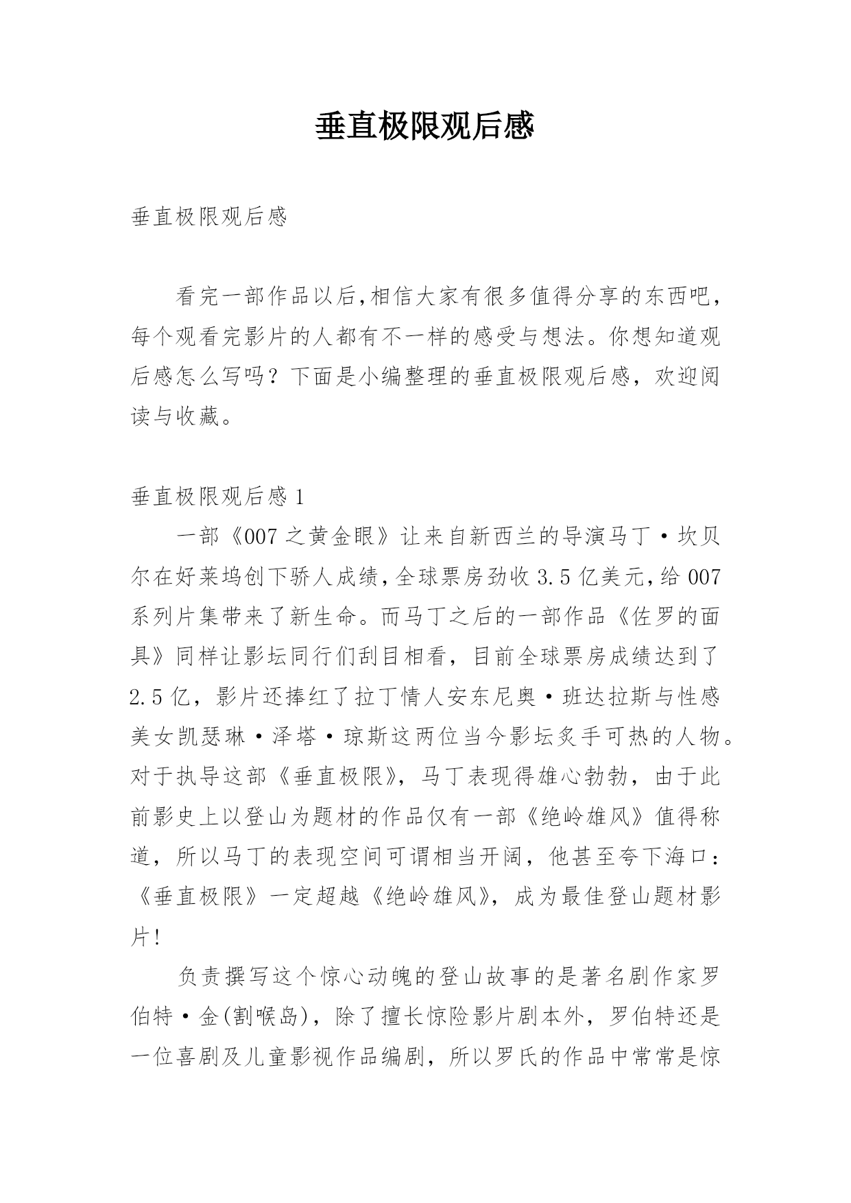 垂直极限观后感垂直极限观后感看完一部作品以后,相信大家有很多值得分享的东西吧,每个观看完影片的人都有不一样的感受与想法。你想知道观后感怎么写吗?下面是小编整理的垂直极限观后感,欢迎阅读与收藏。垂直极限观后感1一部《007之黄金眼》让来自新西兰的导演马丁·坎贝尔在好莱坞创下骄人成绩,全球票房劲收3.5亿美元,给007系列片集带来了新生命。而马丁之后的一部作品《佐罗的面具》同样让影坛同行们刮目相看,目前全球票房成绩达到了2.5亿,影片还捧红了拉丁情人安东尼奥·班达拉斯与性感美女凯瑟琳·泽塔·琼斯这两位当今影坛