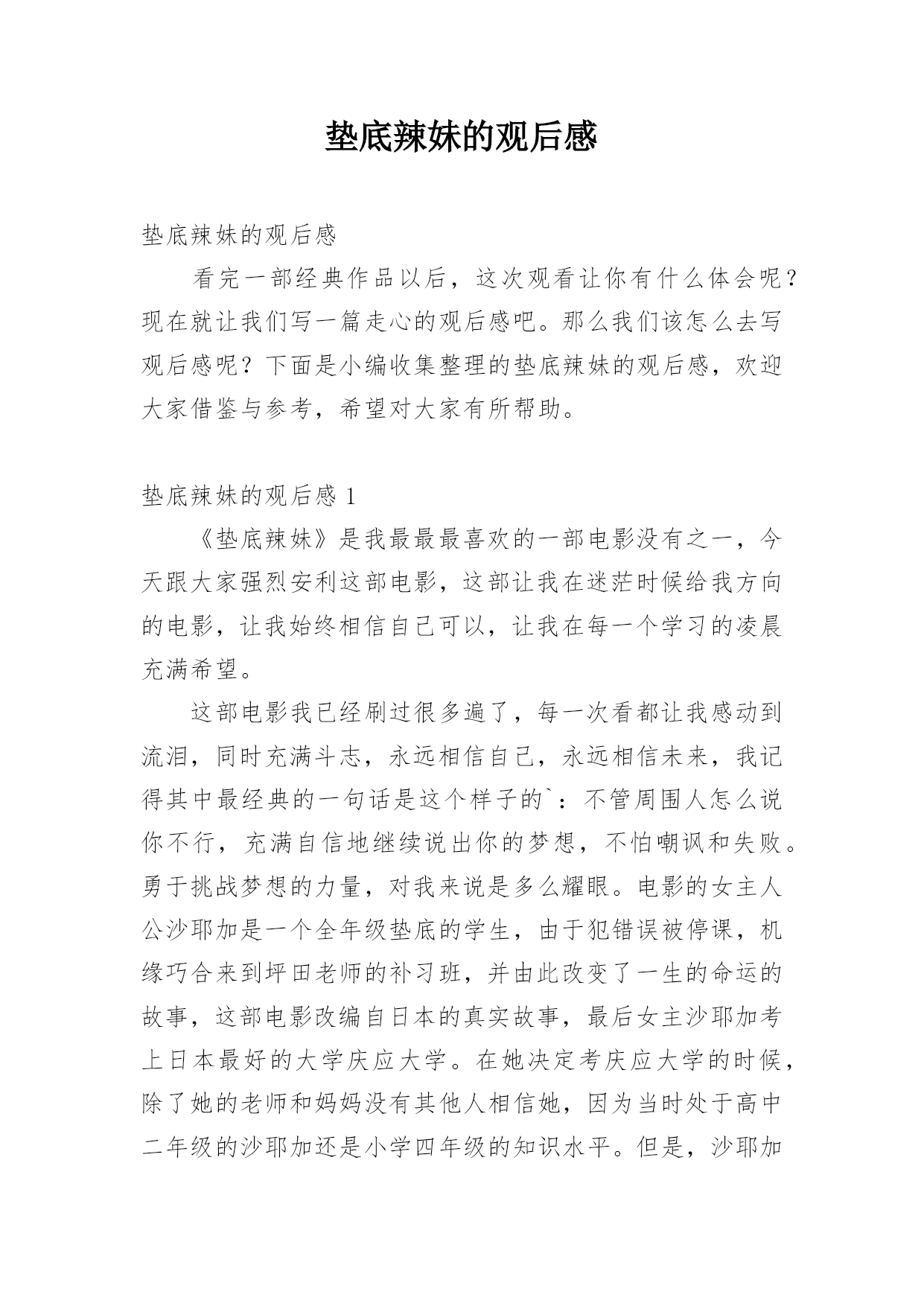 垫底辣妹的观后感垫底辣妹的观后感看完一部经典作品以后,这次观看让你有什么体会呢?现在就让我们写一篇走心的观后感吧。那么我们该怎么去写观后感呢?下面是小编收集整理的垫底辣妹的观后感,欢迎大家借鉴与参考,希望对大家有所帮助。垫底辣妹的观后感1《垫底辣妹》是我最最最喜欢的一部电影没有之一,今天跟大家强烈安利这部电影,这部让我在迷茫时候给我方向的电影,让我始终相信自己可以,让我在每一个学习的凌晨充满希望。这部电影我已经刷过很多遍了,每一次看都让我感动到流泪,同时充满斗志,永远相信自己,永远相信未来,我记得其中最经