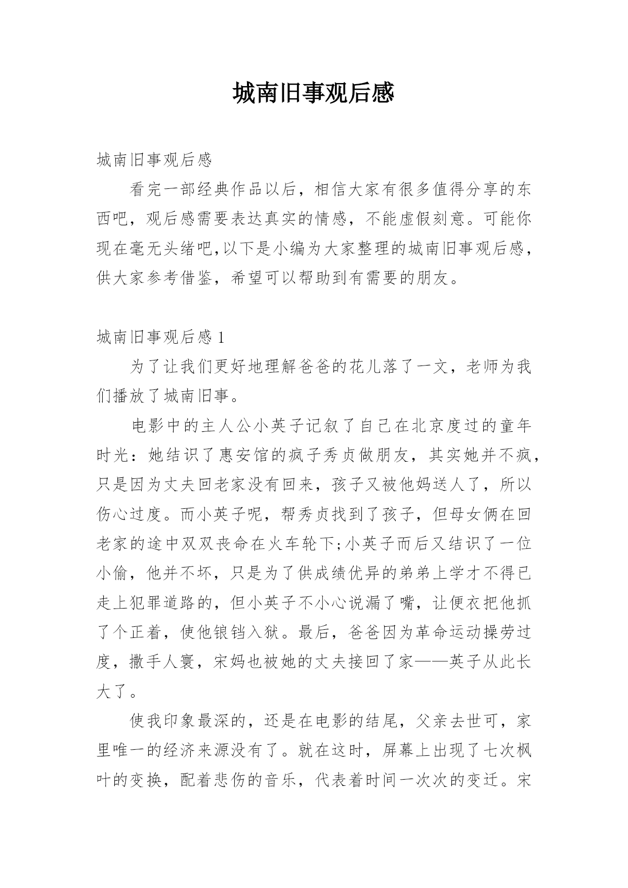 城南旧事观后感城南旧事观后感看完一部经典作品以后,相信大家有很多值得分享的东西吧,观后感需要表达真实的情感,不能虚假刻意。可能你现在毫无头绪吧,以下是小编为大家整理的城南旧事观后感,供大家参考借鉴,希望可以帮助到有需要的朋友。城南旧事观后感1为了让我们更好地理解爸爸的花儿落了一文,老师为我们播放了城南旧事。电影中的主人公小英子记叙了自己在北京度过的童年时光:她结识了惠安馆的疯子秀贞做朋友,其实她并不疯,只是因为丈夫回老家没有回来,孩子又被他妈送人了,所以伤心过度。而小英子呢,帮秀贞找到了孩子,但母女俩在回