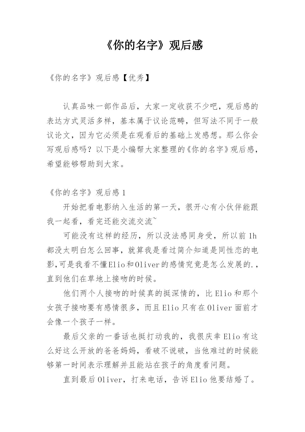 《你的名字》观后感《你的名字》观后感【优秀】认真品味一部作品后,大家一定收获不少吧,观后感的表达方式灵活多样,基本属于议论范畴,但写法不同于一般议论文,因为它必须是在观看后的基础上发感想。那么你会写观后感吗?以下是小编帮大家整理的《你的名字》观后感,希望能够帮助到大家。《你的名字》观后感1开始把看电影纳入生活的第一天,很开心有小伙伴能跟我一起看,看完还能交流交流~可能没有这样的经历,所以没法感同身受,所以前1h都没太明白怎么回事,就算我是看过简介知道是同性恋的电影,可是我看不懂Elio和Oliver的感情