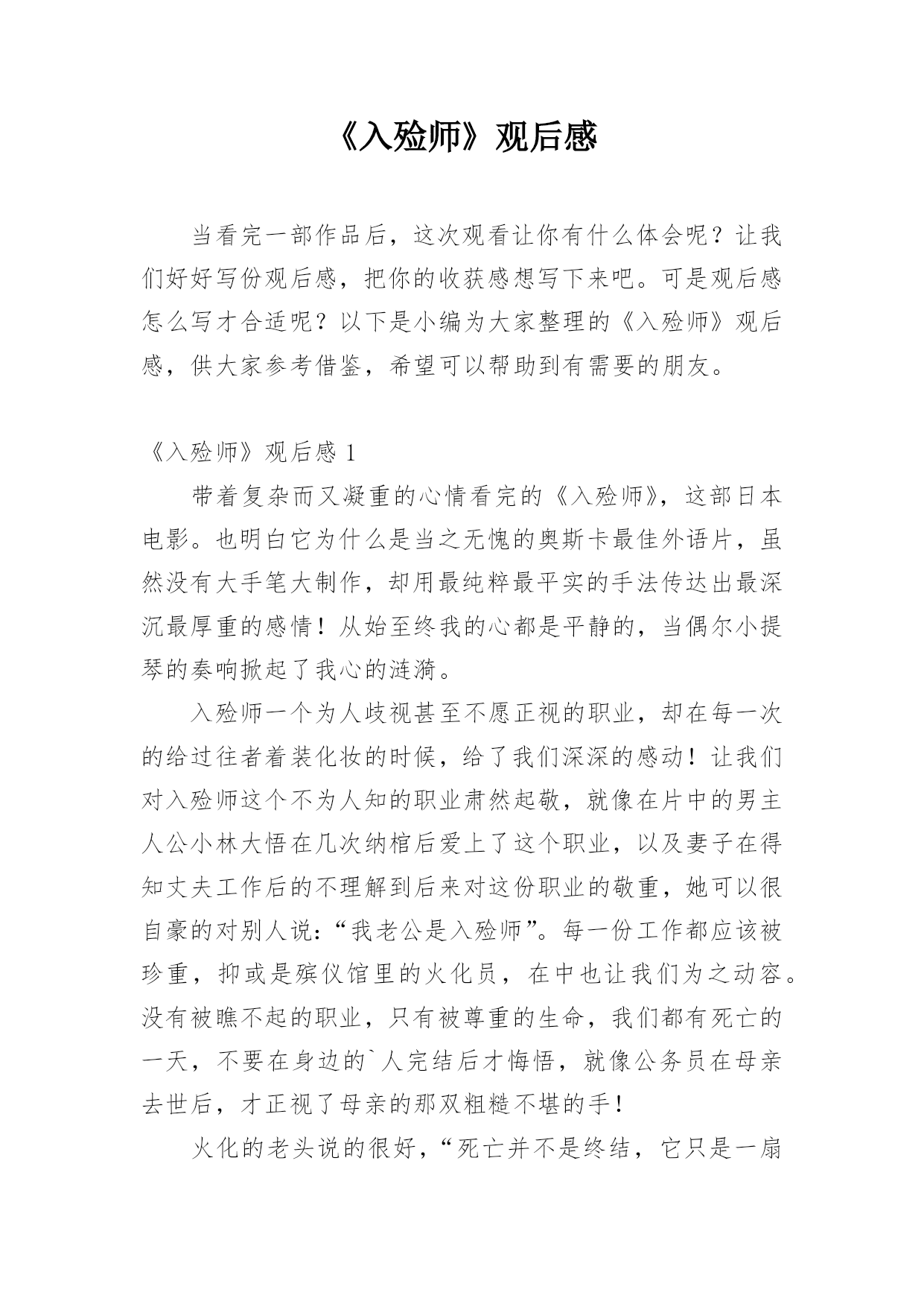 《入殓师》观后感当看完一部作品后,这次观看让你有什么体会呢?让我们好好写份观后感,把你的收获感想写下来吧。可是观后感怎么写才合适呢?以下是小编为大家整理的《入殓师》观后感,供大家参考借鉴,希望可以帮助到有需要的朋友。《入殓师》观后感1带着复杂而又凝重的心情看完的《入殓师》,这部日本电影。也明白它为什么是当之无愧的奥斯卡最佳外语片,虽然没有大手笔大制作,却用最纯粹最平实的手法传达出最深沉最厚重的感情!从始至终我的心都是平静的,当偶尔小提琴的奏响掀起了我心的涟漪。入殓师一个为人歧视甚至不愿正视的职业,却在每一