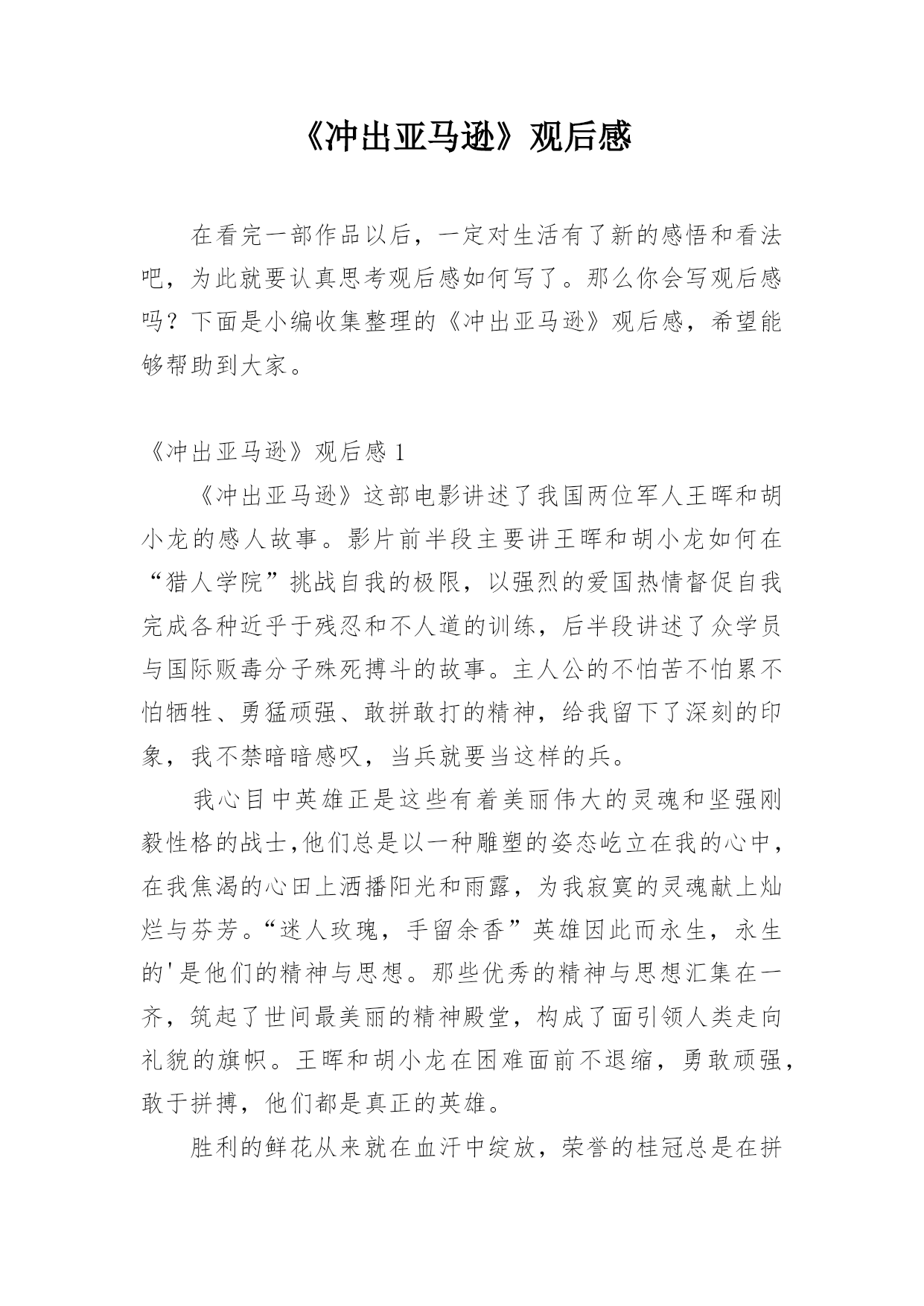 《冲出亚马逊》观后感在看完一部作品以后,一定对生活有了新的感悟和看法吧,为此就要认真思考观后感如何写了。那么你会写观后感吗?下面是小编收集整理的《冲出亚马逊》观后感,希望能够帮助到大家。《冲出亚马逊》观后感1《冲出亚马逊》这部电影讲述了我国两位军人王晖和胡小龙的感人故事。影片前半段主要讲王晖和胡小龙如何在“猎人学院”挑战自我的极限,以强烈的爱国热情督促自我完成各种近乎于残忍和不人道的训练,后半段讲述了众学员与国际贩毒分子殊死搏斗的故事。主人公的不怕苦不怕累不怕牺牲、勇猛顽强、敢拼敢打的精神,给我留下了深刻