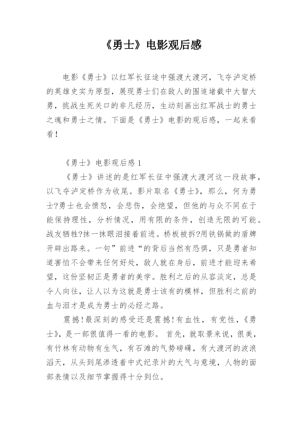 《勇士》电影观后感电影《勇士》以红军长征途中强渡大渡河,飞夺泸定桥的英雄史实为原型,展现勇士们在敌人的围追堵截中大智大勇,挑战生死关口的非凡经历,生动刻画出红军战士的勇士之魂和勇士之情。下面是《勇士》电影的观后感,一起来看看!《勇士》电影观后感1《勇士》讲述的是红军长征中强渡大渡河这一段故事,以飞夺泸定桥作为收尾。影片取名《勇士》,那么,何为勇士?勇士也会愤怒,会悲伤,会绝望,但他的与众不同在于能保持理性,分析情况,用有限的条件,创造无限的可能。战友牺牲?抹一抹眼泪接着前进。桥板被拆?用铁锅做的盾牌开辟出