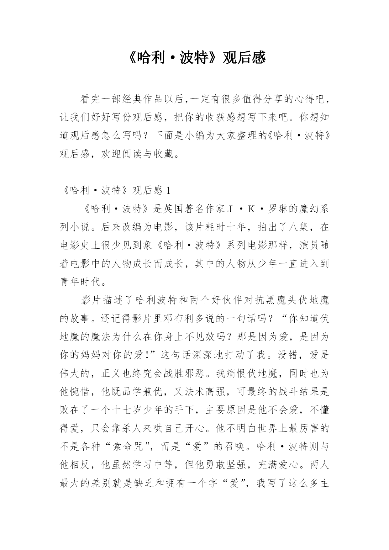 《哈利·波特》观后感看完一部经典作品以后,一定有很多值得分享的心得吧,让我们好好写份观后感,把你的收获感想写下来吧。你想知道观后感怎么写吗?下面是小编为大家整理的《哈利·波特》观后感,欢迎阅读与收藏。《哈利·波特》观后感1《哈利·波特》是英国著名作家J·K·罗琳的魔幻系列小说。后来改编为电影,该片耗时十年,拍出了八集,在电影史上很少见到象《哈利·波特》系列电影那样,演员随着电影中的人物成长而成长,其中的人物从少年一直进入到青年时代。影片描述了哈利波特和两个好伙伴对抗黑魔头伏地魔的故事。还记得影片里邓布利多
