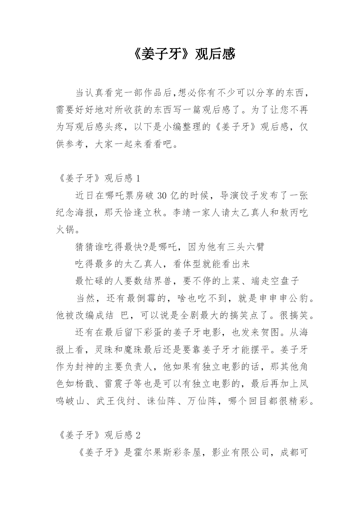 《姜子牙》观后感当认真看完一部作品后,想必你有不少可以分享的东西,需要好好地对所收获的东西写一篇观后感了。为了让您不再为写观后感头疼,以下是小编整理的《姜子牙》观后感,仅供参考,大家一起来看看吧。《姜子牙》观后感1近日在哪吒票房破30亿的时候,导演饺子发布了一张纪念海报,那天恰逢立秋。李靖一家人请太乙真人和敖丙吃火锅。猜猜谁吃得最快?是哪吒,因为他有三头六臂吃得最多的太乙真人,看体型就能看出来最忙碌的人要数结界兽,要不停的上菜、端走空盘子当然,还有最倒霉的,啥也吃不到,就是申申申公豹。他被改编成结巴,可以