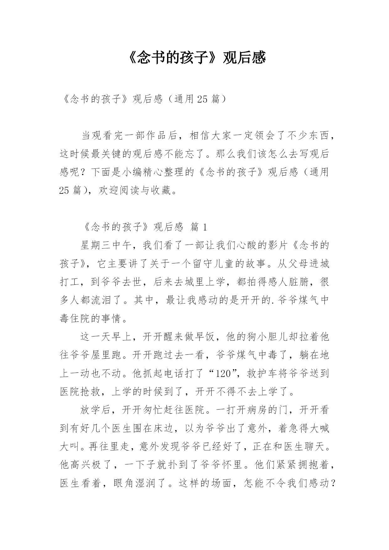 《念书的孩子》观后感《念书的孩子》观后感(通用25篇)当观看完一部作品后,相信大家一定领会了不少东西,这时候最关键的观后感不能忘了。那么我们该怎么去写观后感呢?下面是小编精心整理的《念书的孩子》观后感(通用25篇),欢迎阅读与收藏。《念书的孩子》观后感篇1星期三中午,我们看了一部让我们心酸的影片《念书的孩子》,它主要讲了关于一个留守儿童的故事。从父母进城打工,到爷爷去世,后来去城里上学,都拍得感人脏腑,很多人都流泪了。其中,最让我感动的是开开的.爷爷煤气中毒住院的事情。这一天早上,开开醒来做早饭,他的狗小