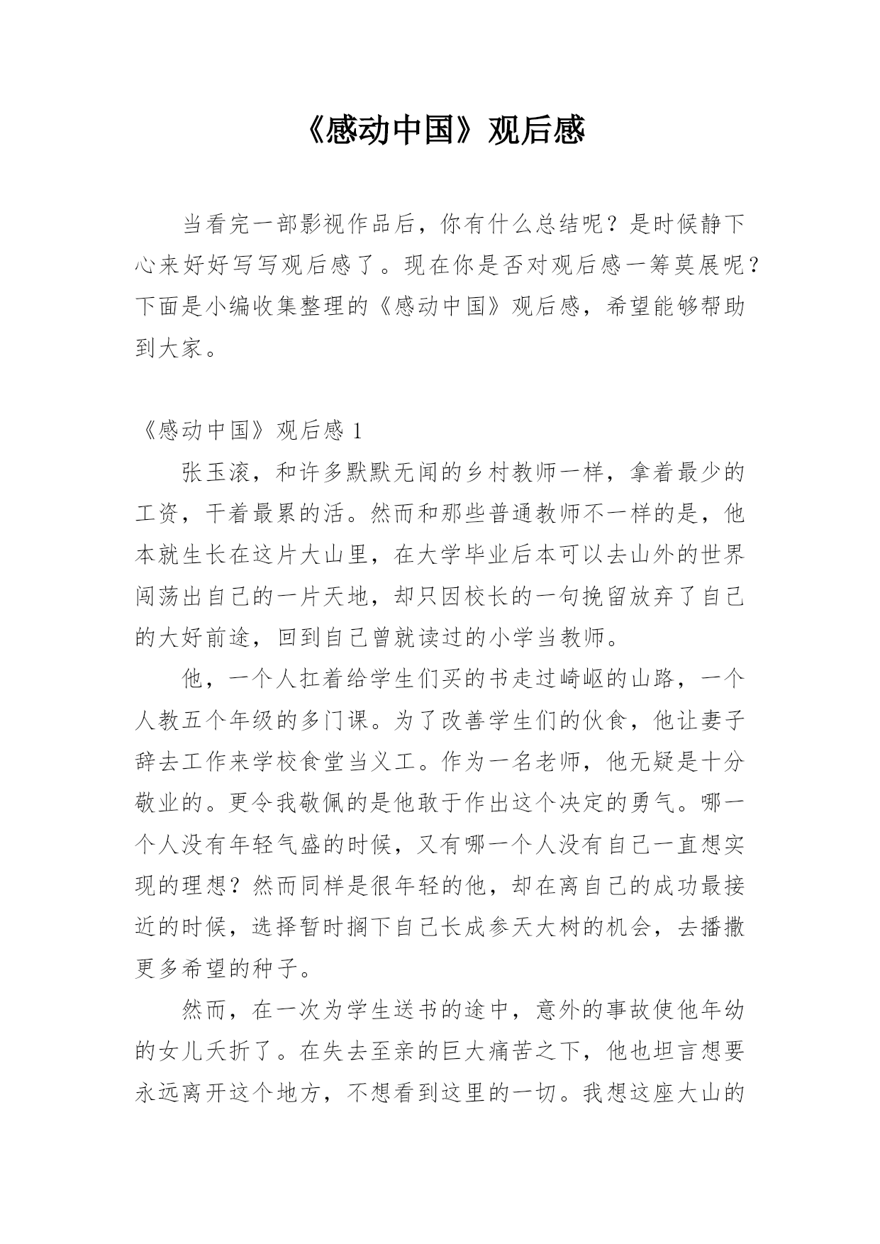 《感动中国》观后感当看完一部影视作品后,你有什么总结呢?是时候静下心来好好写写观后感了。现在你是否对观后感一筹莫展呢?下面是小编收集整理的《感动中国》观后感,希望能够帮助到大家。《感动中国》观后感1张玉滚,和许多默默无闻的乡村教师一样,拿着最少的工资,干着最累的活。然而和那些普通教师不一样的是,他本就生长在这片大山里,在大学毕业后本可以去山外的世界闯荡出自己的一片天地,却只因校长的一句挽留放弃了自己的大好前途,回到自己曾就读过的小学当教师。他,一个人扛着给学生们买的书走过崎岖的山路,一个人教五个年级的多门