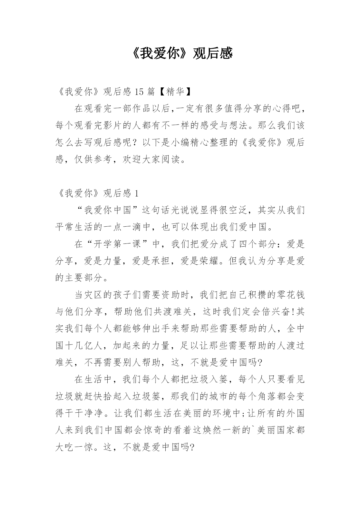 《我爱你》观后感《我爱你》观后感15篇【精华】在观看完一部作品以后,一定有很多值得分享的心得吧,每个观看完影片的人都有不一样的感受与想法。那么我们该怎么去写观后感呢?以下是小编精心整理的《我爱你》观后感,仅供参考,欢迎大家阅读。《我爱你》观后感1“我爱你中国”这句话光说说显得很空泛,其实从我们平常生活的一点一滴中,也可以体现出我们爱中国。在“开学第一课”中,我们把爱分成了四个部分:爱是分享,爱是力量,爱是承担,爱是荣耀。但我认为分享是爱的主要部分。当灾区的孩子们需要资助时,我们把自己积攒的零花钱与他们分享