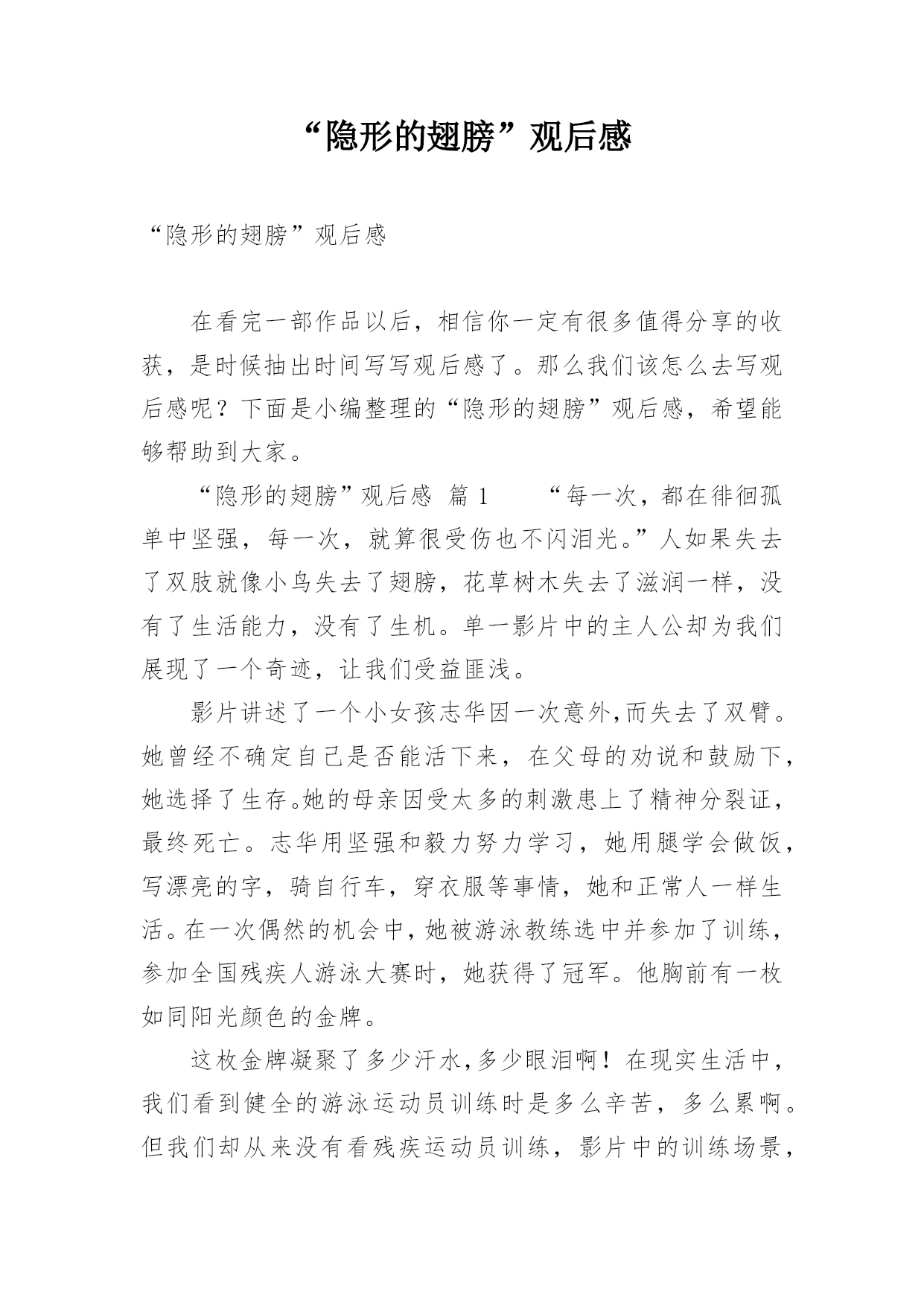 “隐形的翅膀”观后感“隐形的翅膀”观后感在看完一部作品以后,相信你一定有很多值得分享的收获,是时候抽出时间写写观后感了。那么我们该怎么去写观后感呢?下面是小编整理的“隐形的翅膀”观后感,希望能够帮助到大家。“隐形的翅膀”观后感篇1“每一次,都在徘徊孤单中坚强,每一次,就算很受伤也不闪泪光。”人如果失去了双肢就像小鸟失去了翅膀,花草树木失去了滋润一样,没有了生活能力,没有了生机。单一影片中的主人公却为我们展现了一个奇迹,让我们受益匪浅。影片讲述了一个小女孩志华因一次意外,而失去了双臂。她曾经不确定自己是否能