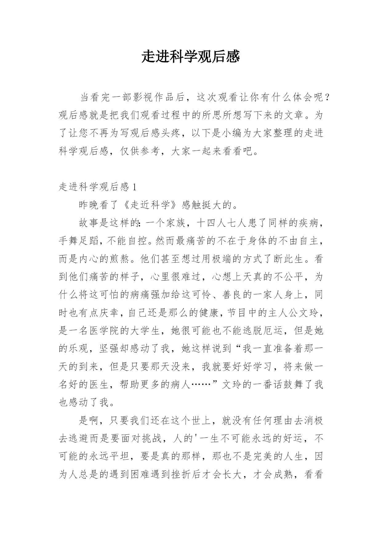 走进科学观后感当看完一部影视作品后,这次观看让你有什么体会呢?观后感就是把我们观看过程中的所思所想写下来的文章。为了让您不再为写观后感头疼,以下是小编为大家整理的走进科学观后感,仅供参考,大家一起来看看吧。走进科学观后感1昨晚看了《走近科学》感触挺大的。故事是这样的:一个家族,十四人七人患了同样的疾病,手舞足蹈,不能自控。然而最痛苦的不在于身体的不由自主,而是内心的煎熬。他们甚至想过用极端的方式了断此生。看到他们痛苦的样子,心里很难过,心想上天真的不公平,为什么将这可怕的病痛强加给这可怜、善良的一家人身上