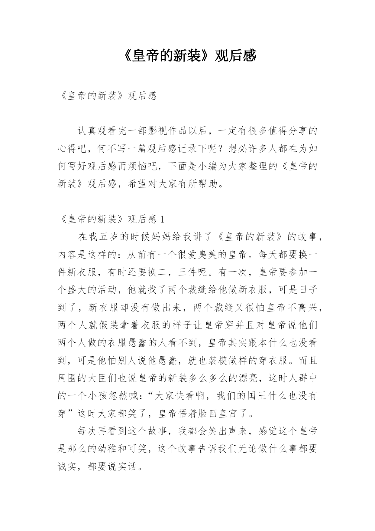 《皇帝的新装》观后感《皇帝的新装》观后感认真观看完一部影视作品以后,一定有很多值得分享的心得吧,何不写一篇观后感记录下呢?想必许多人都在为如何写好观后感而烦恼吧,下面是小编为大家整理的《皇帝的新装》观后感,希望对大家有所帮助。《皇帝的新装》观后感1在我五岁的时候妈妈给我讲了《皇帝的新装》的故事,内容是这样的:从前有一个很爱臭美的皇帝。每天都要换一件新衣服,有时还要换二,三件呢。有一次,皇帝要参加一个盛大的活动,他就找了两个裁缝给他做新衣服,可是日子到了,新衣服却没有做出来,两个裁缝又很怕皇帝不高兴,两个人