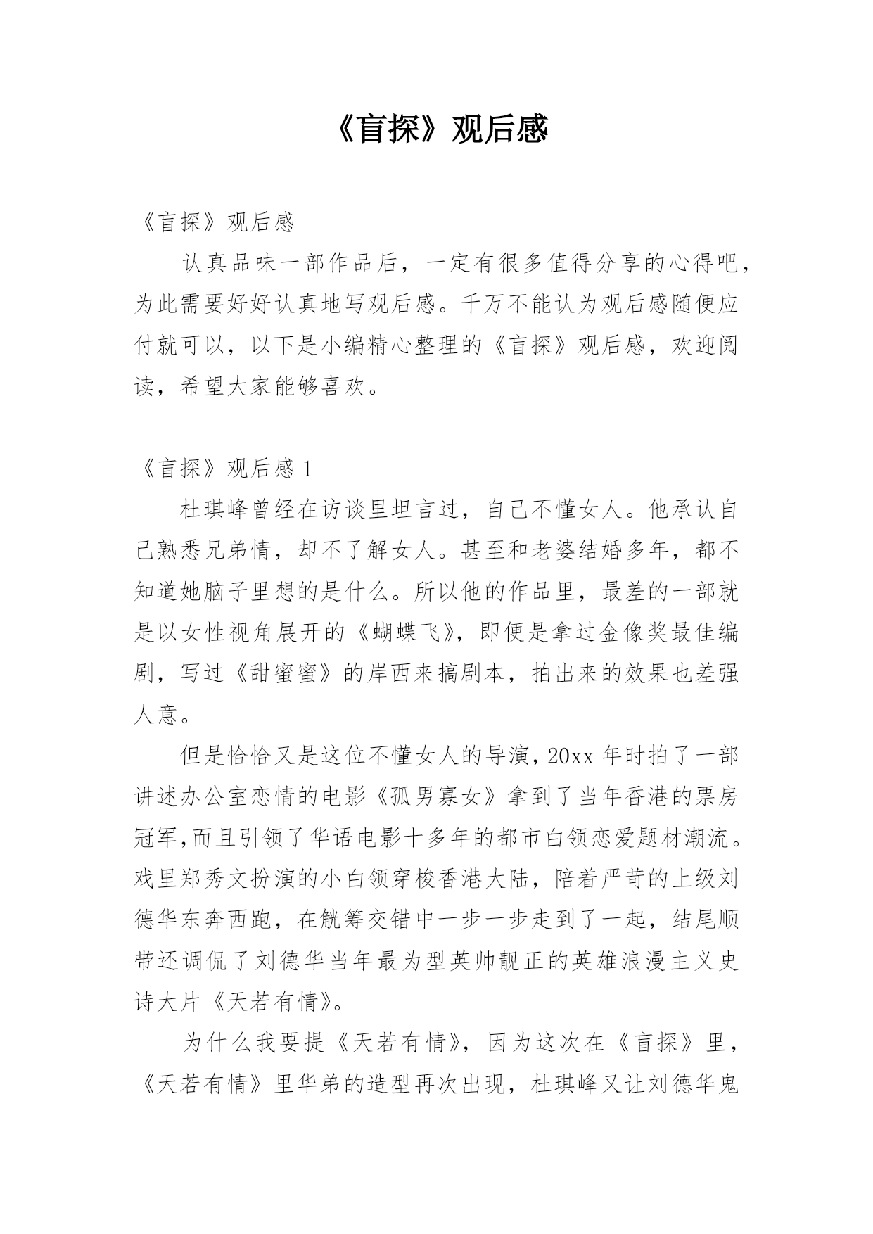 《盲探》观后感《盲探》观后感认真品味一部作品后,一定有很多值得分享的心得吧,为此需要好好认真地写观后感。千万不能认为观后感随便应付就可以,以下是小编精心整理的《盲探》观后感,欢迎阅读,希望大家能够喜欢。《盲探》观后感1杜琪峰曾经在访谈里坦言过,自己不懂女人。他承认自己熟悉兄弟情,却不了解女人。甚至和老婆结婚多年,都不知道她脑子里想的是什么。所以他的作品里,最差的一部就是以女性视角展开的《蝴蝶飞》,即便是拿过金像奖最佳编剧,写过《甜蜜蜜》的岸西来搞剧本,拍出来的效果也差强人意。但是恰恰又是这位不懂女人的导演