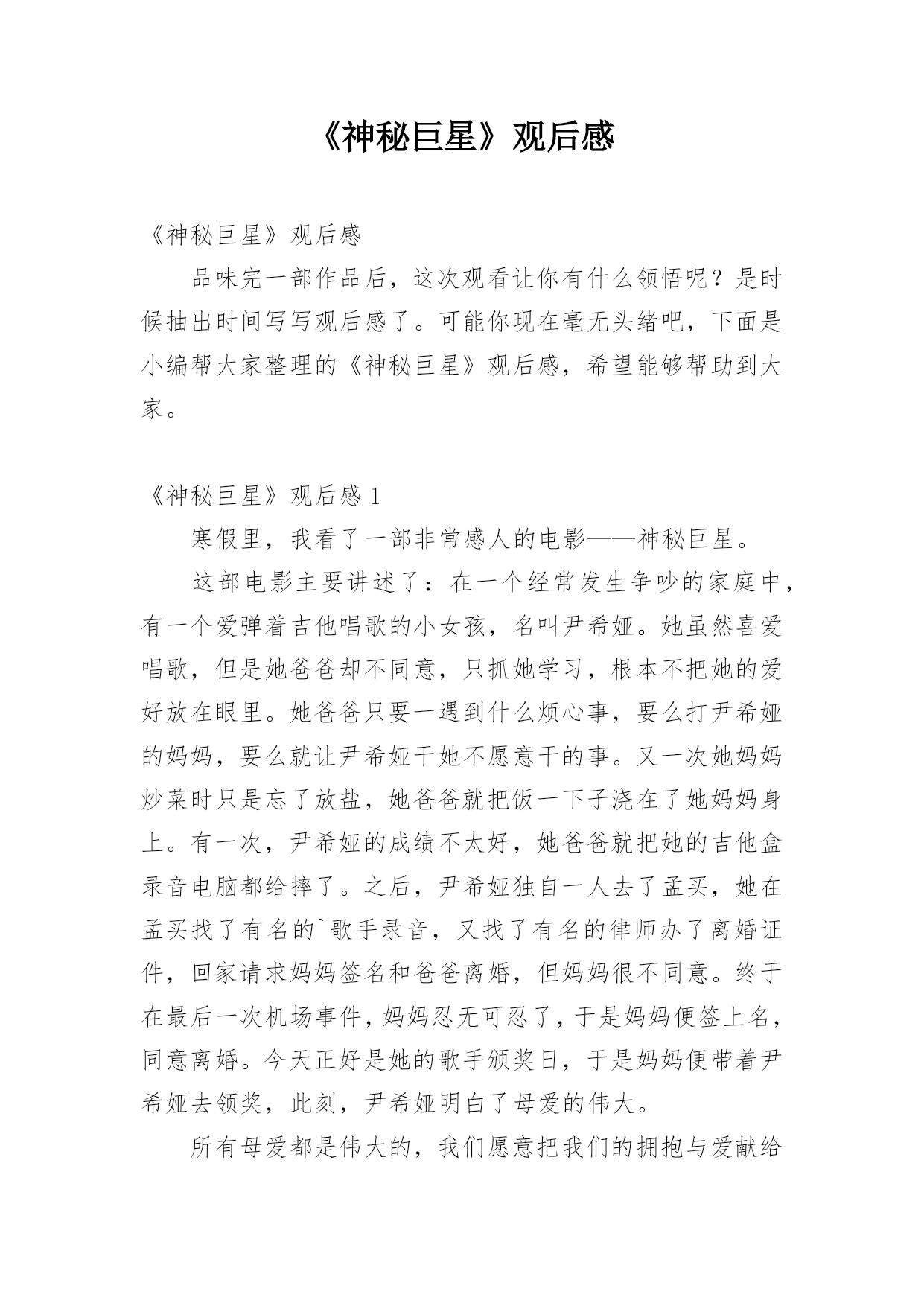 《神秘巨星》观后感《神秘巨星》观后感品味完一部作品后,这次观看让你有什么领悟呢?是时候抽出时间写写观后感了。可能你现在毫无头绪吧,下面是小编帮大家整理的《神秘巨星》观后感,希望能够帮助到大家。《神秘巨星》观后感1寒假里,我看了一部非常感人的电影——神秘巨星。这部电影主要讲述了:在一个经常发生争吵的家庭中,有一个爱弹着吉他唱歌的小女孩,名叫尹希娅。她虽然喜爱唱歌,但是她爸爸却不同意,只抓她学习,根本不把她的爱好放在眼里。她爸爸只要一遇到什么烦心事,要么打尹希娅的妈妈,要么就让尹希娅干她不愿意干的事。又一次她