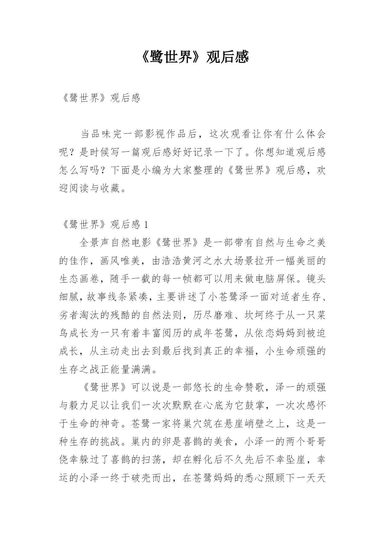 《鹭世界》观后感《鹭世界》观后感当品味完一部影视作品后,这次观看让你有什么体会呢?是时候写一篇观后感好好记录一下了。你想知道观后感怎么写吗?下面是小编为大家整理的《鹭世界》观后感,欢迎阅读与收藏。《鹭世界》观后感1全景声自然电影《鹭世界》是一部带有自然与生命之美的佳作,画风唯美,由浩浩黄河之水大场景拉开一幅美丽的生态画卷,随手一截的每一帧都可以用来做电脑屏保。镜头细腻,故事线条紧凑,主要讲述了小苍鹭泽一面对适者生存、劣者淘汰的残酷的自然法则,历尽磨难、坎坷终于从一只菜鸟成长为一只有着丰富阅历的成年苍鹭,从