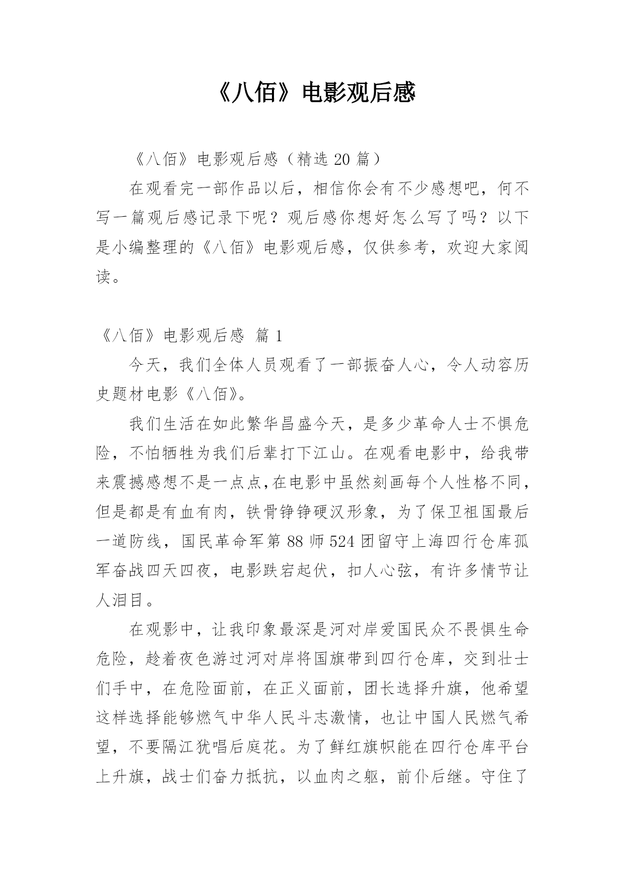 《八佰》电影观后感《八佰》电影观后感(精选20篇)在观看完一部作品以后,相信你会有不少感想吧,何不写一篇观后感记录下呢?观后感你想好怎么写了吗?以下是小编整理的《八佰》电影观后感,仅供参考,欢迎大家阅读。《八佰》电影观后感篇1今天,我们全体人员观看了一部振奋人心,令人动容历史题材电影《八佰》。我们生活在如此繁华昌盛今天,是多少革命人士不惧危险,不怕牺牲为我们后辈打下江山。在观看电影中,给我带来震撼感想不是一点点,在电影中虽然刻画每个人性格不同,但是都是有血有肉,铁骨铮铮硬汉形象,为了保卫祖国最后一道防线,
