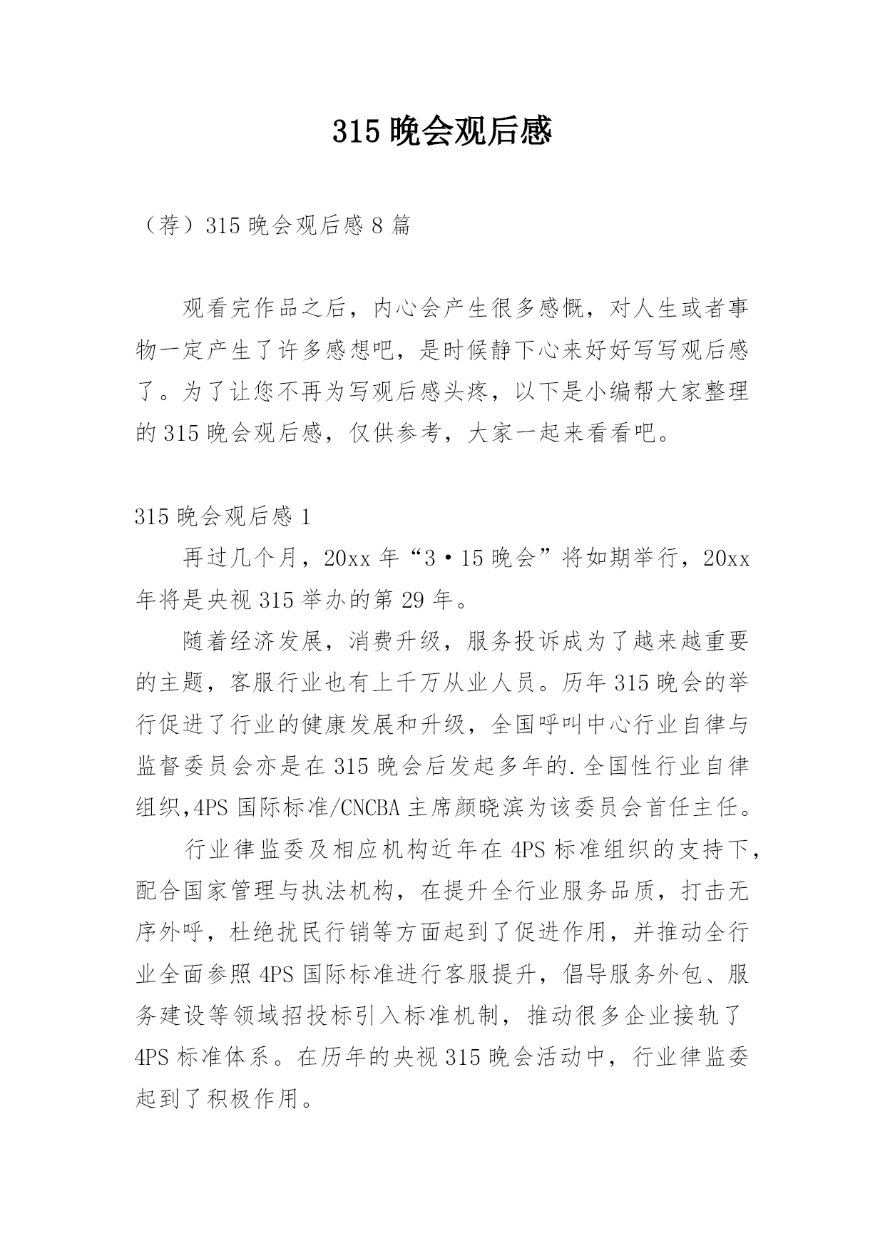 315晚会观后感(荐)315晚会观后感8篇观看完作品之后,内心会产生很多感慨,对人生或者事物一定产生了许多感想吧,是时候静下心来好好写写观后感了。为了让您不再为写观后感头疼,以下是小编帮大家整理的315晚会观后感,仅供参考,大家一起来看看吧。315晚会观后感1再过几个月,20xx年“3·15晚会”将如期举行,20xx年将是央视315举办的第29年。随着经济发展,消费升级,服务投诉成为了越来越重要的主题,客服行业也有上千万从业人员。历年315晚会的举行促进了行业的健康发展和升级,全国呼叫中心行业自律与监督委