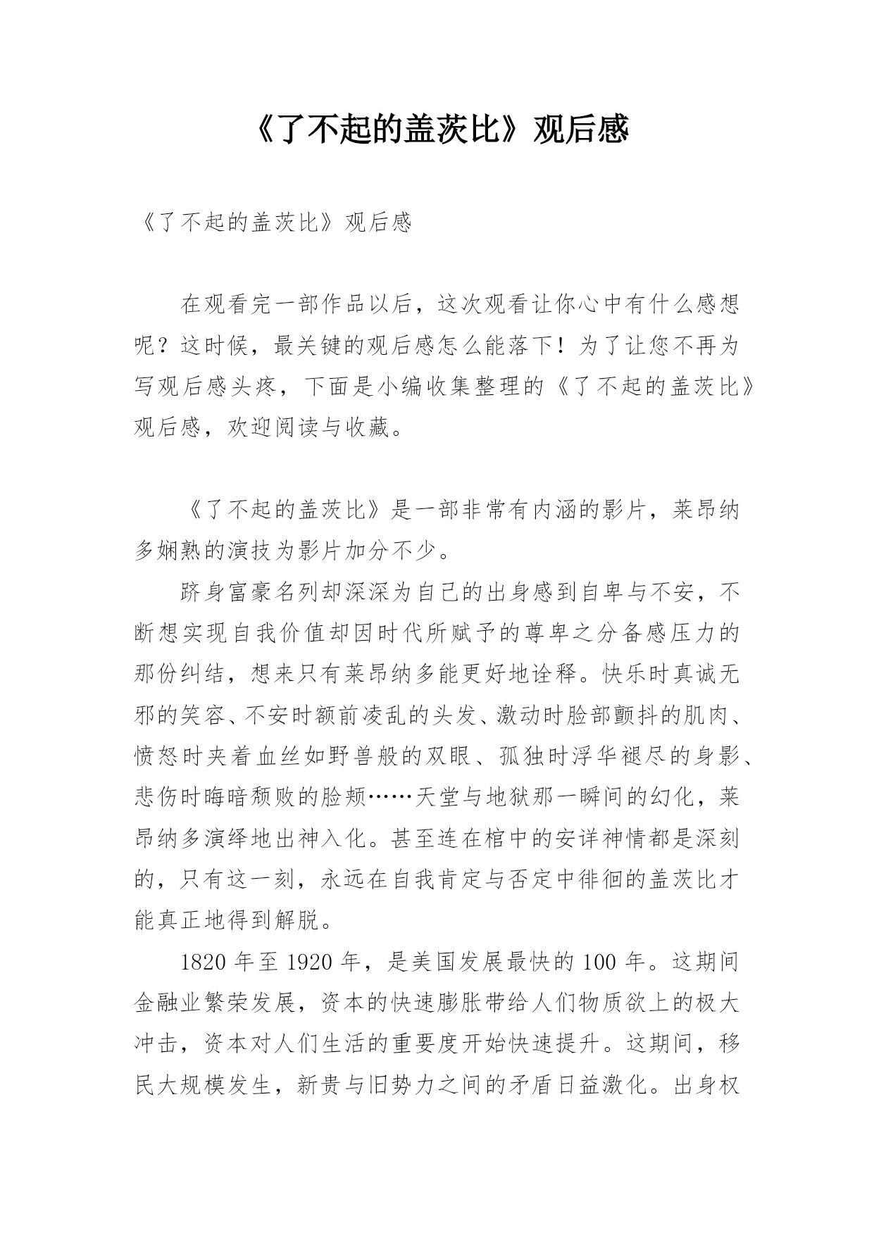 《了不起的盖茨比》观后感《了不起的盖茨比》观后感在观看完一部作品以后,这次观看让你心中有什么感想呢?这时候,最关键的观后感怎么能落下!为了让您不再为写观后感头疼,下面是小编收集整理的《了不起的盖茨比》观后感,欢迎阅读与收藏。《了不起的盖茨比》是一部非常有内涵的影片,莱昂纳多娴熟的演技为影片加分不少。跻身富豪名列却深深为自己的出身感到自卑与不安,不断想实现自我价值却因时代所赋予的尊卑之分备感压力的那份纠结,想来只有莱昂纳多能更好地诠释。快乐时真诚无邪的笑容、不安时额前凌乱的头发、激动时脸部颤抖的肌肉、愤怒时