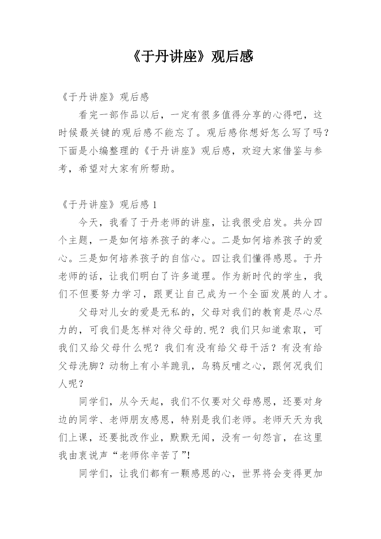 《于丹讲座》观后感《于丹讲座》观后感看完一部作品以后,一定有很多值得分享的心得吧,这时候最关键的观后感不能忘了。观后感你想好怎么写了吗?下面是小编整理的《于丹讲座》观后感,欢迎大家借鉴与参考,希望对大家有所帮助。《于丹讲座》观后感1今天,我看了于丹老师的讲座,让我很受启发。共分四个主题,一是如何培养孩子的孝心。二是如何培养孩子的爱心。三是如何培养孩子的自信心。四让我们懂得感恩。于丹老师的话,让我们明白了许多道理。作为新时代的学生,我们不但要努力学习,跟更让自己成为一个全面发展的人才。父母对儿女的爱是无私的