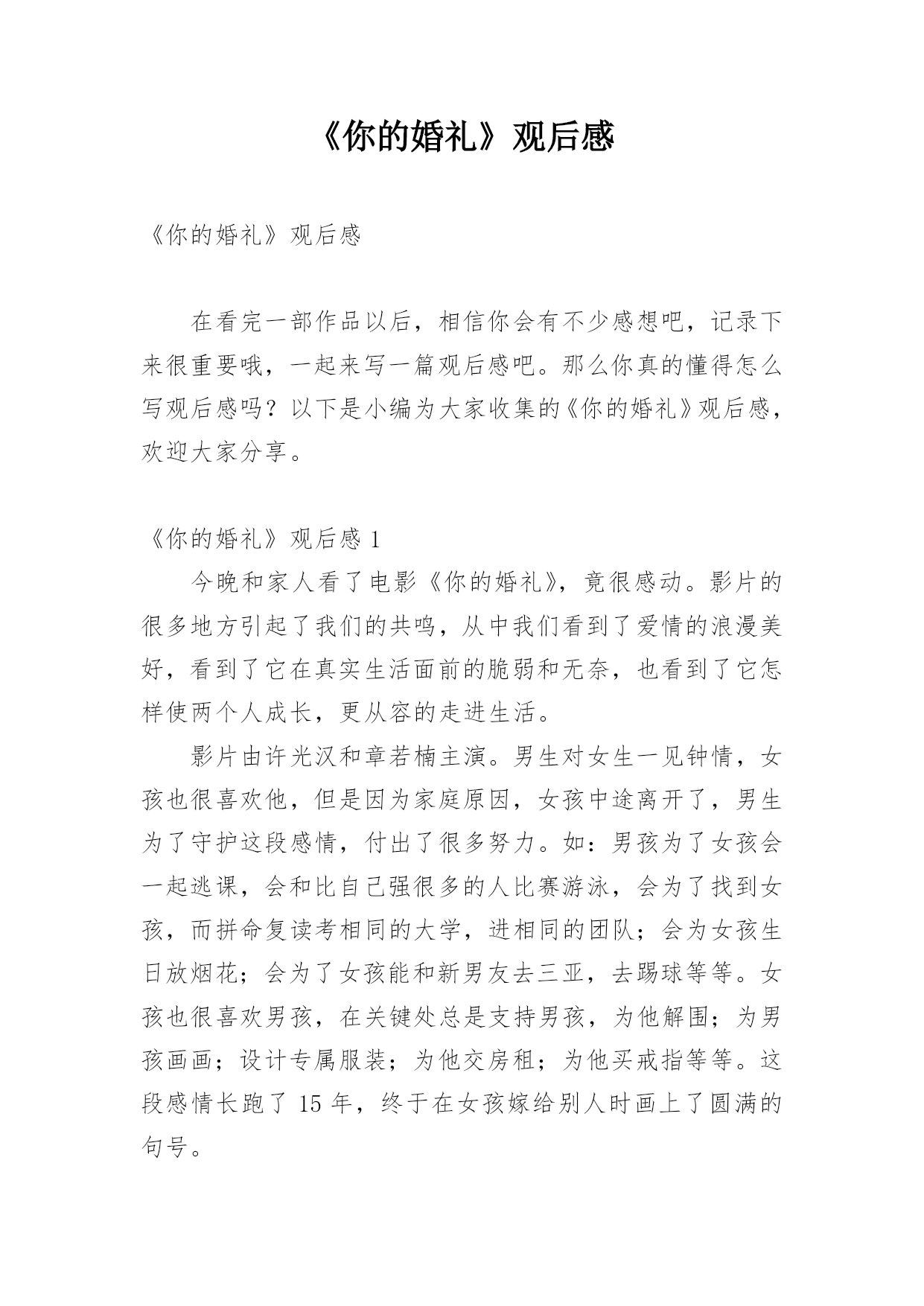 《你的婚礼》观后感《你的婚礼》观后感在看完一部作品以后,相信你会有不少感想吧,记录下来很重要哦,一起来写一篇观后感吧。那么你真的懂得怎么写观后感吗?以下是小编为大家收集的《你的婚礼》观后感,欢迎大家分享。《你的婚礼》观后感1今晚和家人看了电影《你的婚礼》,竟很感动。影片的很多地方引起了我们的共鸣,从中我们看到了爱情的浪漫美好,看到了它在真实生活面前的脆弱和无奈,也看到了它怎样使两个人成长,更从容的走进生活。影片由许光汉和章若楠主演。男生对女生一见钟情,女孩也很喜欢他,但是因为家庭原因,女孩中途离开了,男生