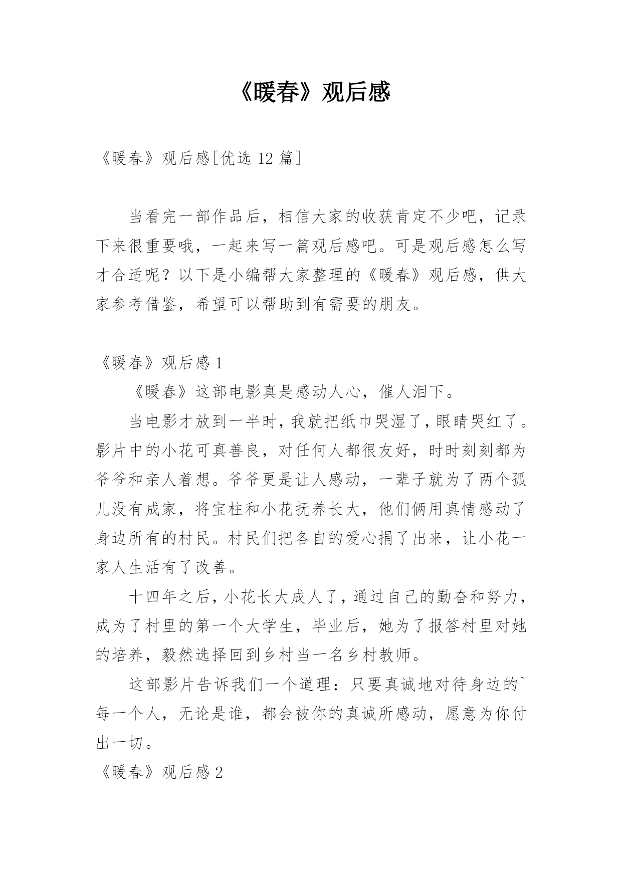 《暖春》观后感《暖春》观后感[优选12篇]当看完一部作品后,相信大家的收获肯定不少吧,记录下来很重要哦,一起来写一篇观后感吧。可是观后感怎么写才合适呢?以下是小编帮大家整理的《暖春》观后感,供大家参考借鉴,希望可以帮助到有需要的朋友。《暖春》观后感1《暖春》这部电影真是感动人心,催人泪下。当电影才放到一半时,我就把纸巾哭湿了,眼睛哭红了。影片中的小花可真善良,对任何人都很友好,时时刻刻都为爷爷和亲人着想。爷爷更是让人感动,一辈子就为了两个孤儿没有成家,将宝柱和小花抚养长大,他们俩用真情感动了身边所有的村民