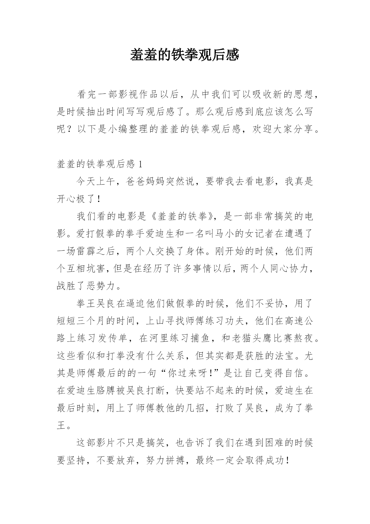 羞羞的铁拳观后感看完一部影视作品以后,从中我们可以吸收新的思想,是时候抽出时间写写观后感了。那么观后感到底应该怎么写呢?以下是小编整理的羞羞的铁拳观后感,欢迎大家分享。羞羞的铁拳观后感1今天上午,爸爸妈妈突然说,要带我去看电影,我真是开心极了!我们看的电影是《羞羞的铁拳》,是一部非常搞笑的电影。爱打假拳的拳手爱迪生和一名叫马小的女记者在遭遇了一场雷霹之后,两个人交换了身体。刚开始的时候,他们两个互相坑害,但是在经历了许多事情以后,两个人同心协力,战胜了恶势力。拳王吴良在逼迫他们做假拳的时候,他们不妥协,用