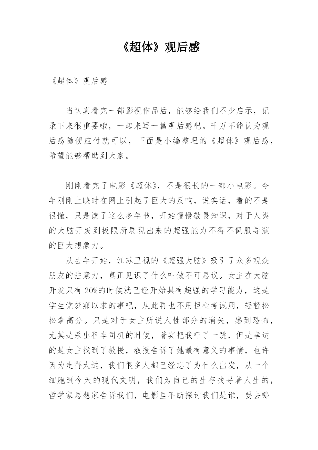 《超体》观后感《超体》观后感当认真看完一部影视作品后,能够给我们不少启示,记录下来很重要哦,一起来写一篇观后感吧。千万不能认为观后感随便应付就可以,下面是小编整理的《超体》观后感,希望能够帮助到大家。刚刚看完了电影《超体》,不是很长的一部小电影。今年刚刚上映时在网上引起了巨大的反响,说实话,看的不是很懂,只是读了这么多年书,开始慢慢敬畏知识,对于人类的大脑开发到极限所展现出来的超强能力不得不佩服导演的巨大想象力。从去年开始,江苏卫视的《超强大脑》吸引了众多观众朋友的注意力,真正见识了什么叫做不可思议。女主