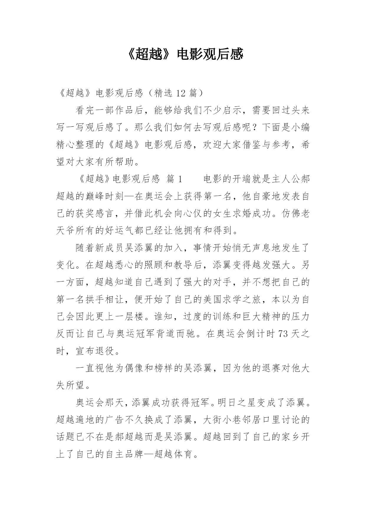 《超越》电影观后感《超越》电影观后感(精选12篇)看完一部作品后,能够给我们不少启示,需要回过头来写一写观后感了。那么我们如何去写观后感呢?下面是小编精心整理的《超越》电影观后感,欢迎大家借鉴与参考,希望对大家有所帮助。《超越》电影观后感篇1电影的开端就是主人公郝超越的巅峰时刻—在奥运会上获得第一名,他自豪地发表自己的获奖感言,并借此机会向心仪的女生求婚成功。仿佛老天爷所有的好运气都已经让他拥有和得到。随着新成员吴添翼的加入,事情开始悄无声息地发生了变化。在超越悉心的照顾和教导后,添翼变得越发强大。另一方