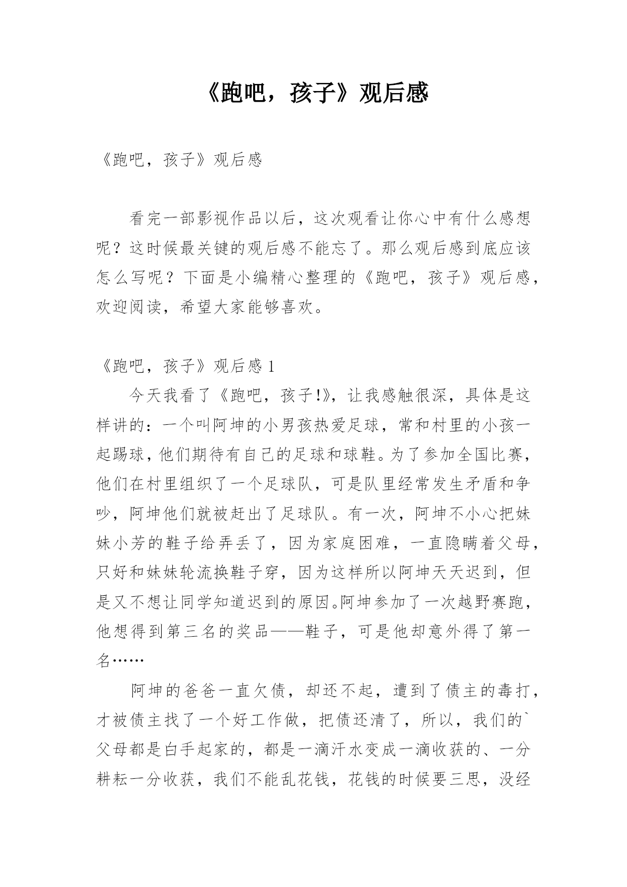 《跑吧,孩子》观后感《跑吧,孩子》观后感看完一部影视作品以后,这次观看让你心中有什么感想呢?这时候最关键的观后感不能忘了。那么观后感到底应该怎么写呢?下面是小编精心整理的《跑吧,孩子》观后感,欢迎阅读,希望大家能够喜欢。《跑吧,孩子》观后感1今天我看了《跑吧,孩子!》,让我感触很深,具体是这样讲的:一个叫阿坤的小男孩热爱足球,常和村里的小孩一起踢球,他们期待有自己的足球和球鞋。为了参加全国比赛,他们在村里组织了一个足球队,可是队里经常发生矛盾和争吵,阿坤他们就被赶出了足球队。有一次,阿坤不小心把妹妹小芳的