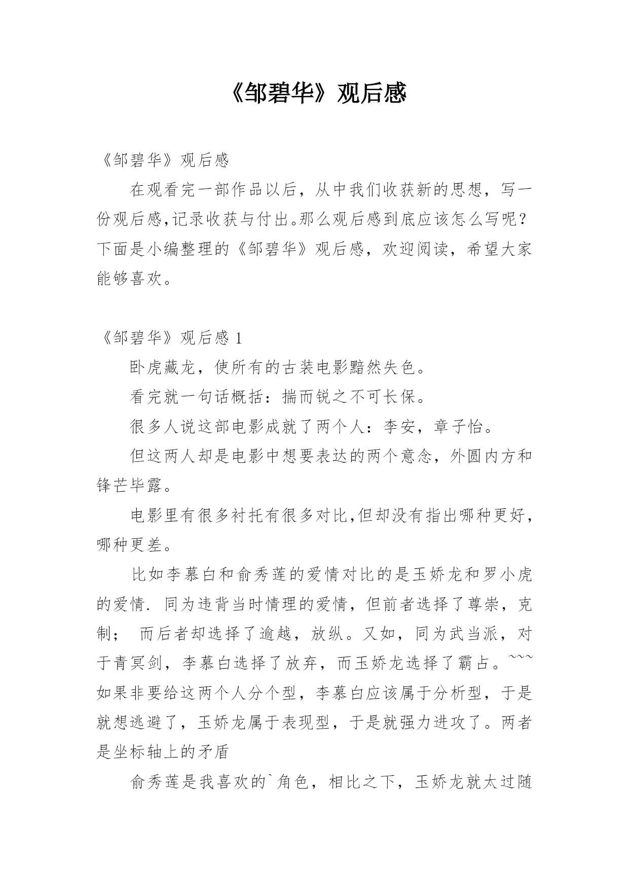 《邹碧华》观后感《邹碧华》观后感在观看完一部作品以后,从中我们收获新的思想,写一份观后感,记录收获与付出。那么观后感到底应该怎么写呢?下面是小编整理的《邹碧华》观后感,欢迎阅读,希望大家能够喜欢。《邹碧华》观后感1卧虎藏龙,使所有的古装电影黯然失色。看完就一句话概括:揣而锐之不可长保。很多人说这部电影成就了两个人:李安,章子怡。但这两人却是电影中想要表达的两个意念,外圆内方和锋芒毕露。电影里有很多衬托有很多对比,但却没有指出哪种更好,哪种更差。比如李慕白和俞秀莲的爱情对比的是玉娇龙和罗小虎的爱情.同为违背