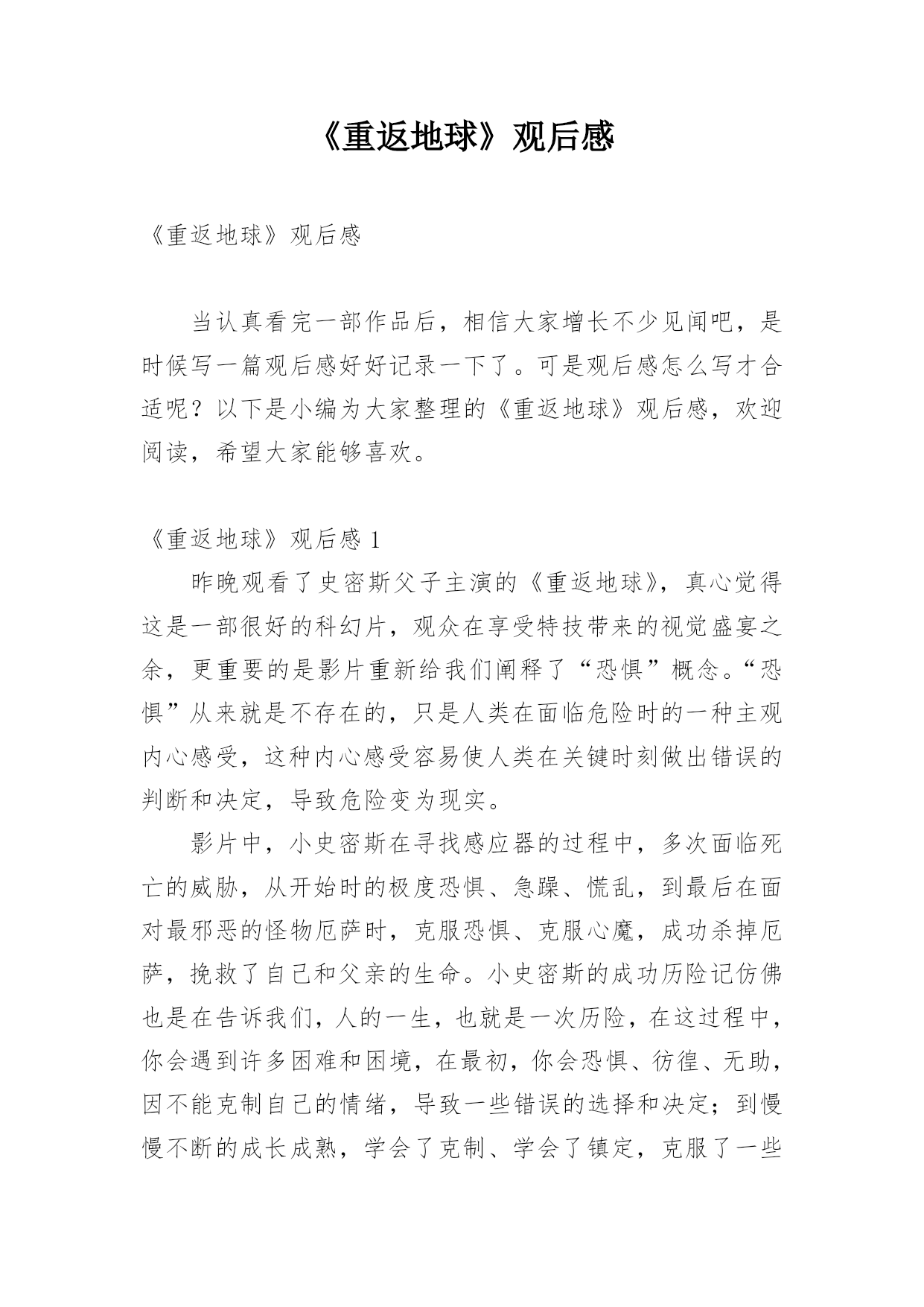 《重返地球》观后感《重返地球》观后感当认真看完一部作品后,相信大家增长不少见闻吧,是时候写一篇观后感好好记录一下了。可是观后感怎么写才合适呢?以下是小编为大家整理的《重返地球》观后感,欢迎阅读,希望大家能够喜欢。《重返地球》观后感1昨晚观看了史密斯父子主演的《重返地球》,真心觉得这是一部很好的科幻片,观众在享受特技带来的视觉盛宴之余,更重要的是影片重新给我们阐释了“恐惧”概念。“恐惧”从来就是不存在的,只是人类在面临危险时的一种主观内心感受,这种内心感受容易使人类在关键时刻做出错误的判断和决定,导致危险变