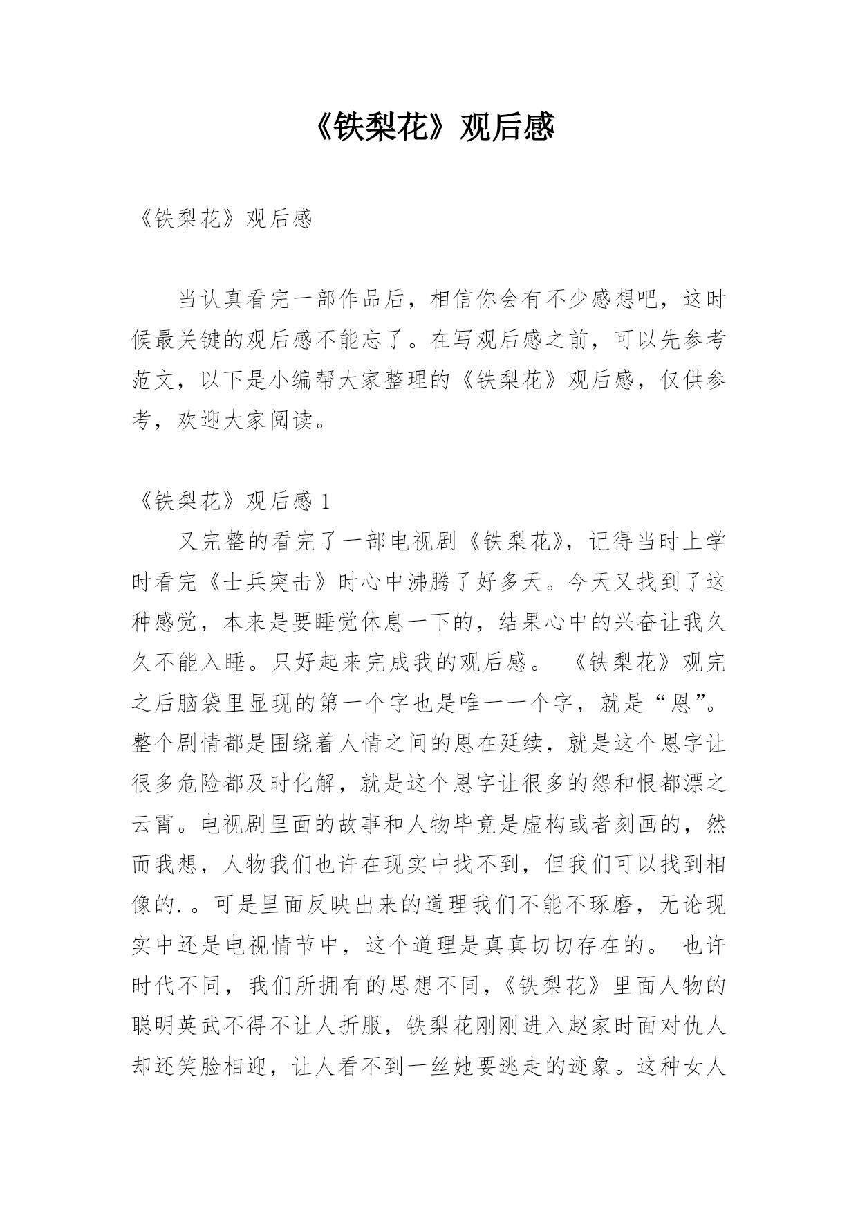 《铁梨花》观后感《铁梨花》观后感当认真看完一部作品后,相信你会有不少感想吧,这时候最关键的观后感不能忘了。在写观后感之前,可以先参考范文,以下是小编帮大家整理的《铁梨花》观后感,仅供参考,欢迎大家阅读。《铁梨花》观后感1又完整的看完了一部电视剧《铁梨花》,记得当时上学时看完《士兵突击》时心中沸腾了好多天。今天又找到了这种感觉,本来是要睡觉休息一下的,结果心中的兴奋让我久久不能入睡。只好起来完成我的观后感。《铁梨花》观完之后脑袋里显现的第一个字也是唯一一个字,就是“恩”。整个剧情都是围绕着人情之间的恩在延续
