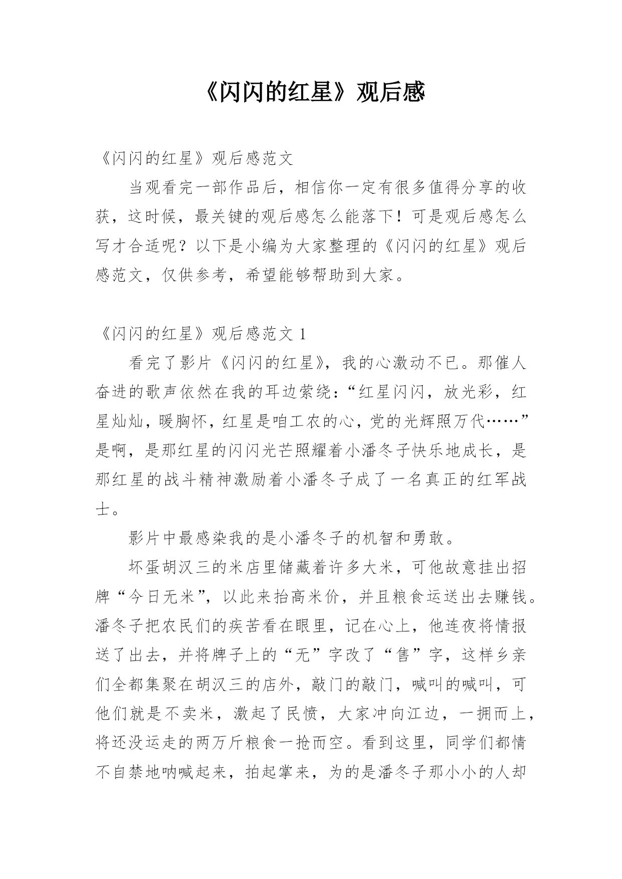 《闪闪的红星》观后感《闪闪的红星》观后感范文当观看完一部作品后,相信你一定有很多值得分享的收获,这时候,最关键的观后感怎么能落下!可是观后感怎么写才合适呢?以下是小编为大家整理的《闪闪的红星》观后感范文,仅供参考,希望能够帮助到大家。《闪闪的红星》观后感范文1看完了影片《闪闪的红星》,我的心激动不已。那催人奋进的歌声依然在我的耳边萦绕:“红星闪闪,放光彩,红星灿灿,暖胸怀,红星是咱工农的心,党的光辉照万代……”是啊,是那红星的闪闪光芒照耀着小潘冬子快乐地成长,是那红星的战斗精神激励着小潘冬子成了一名真正的