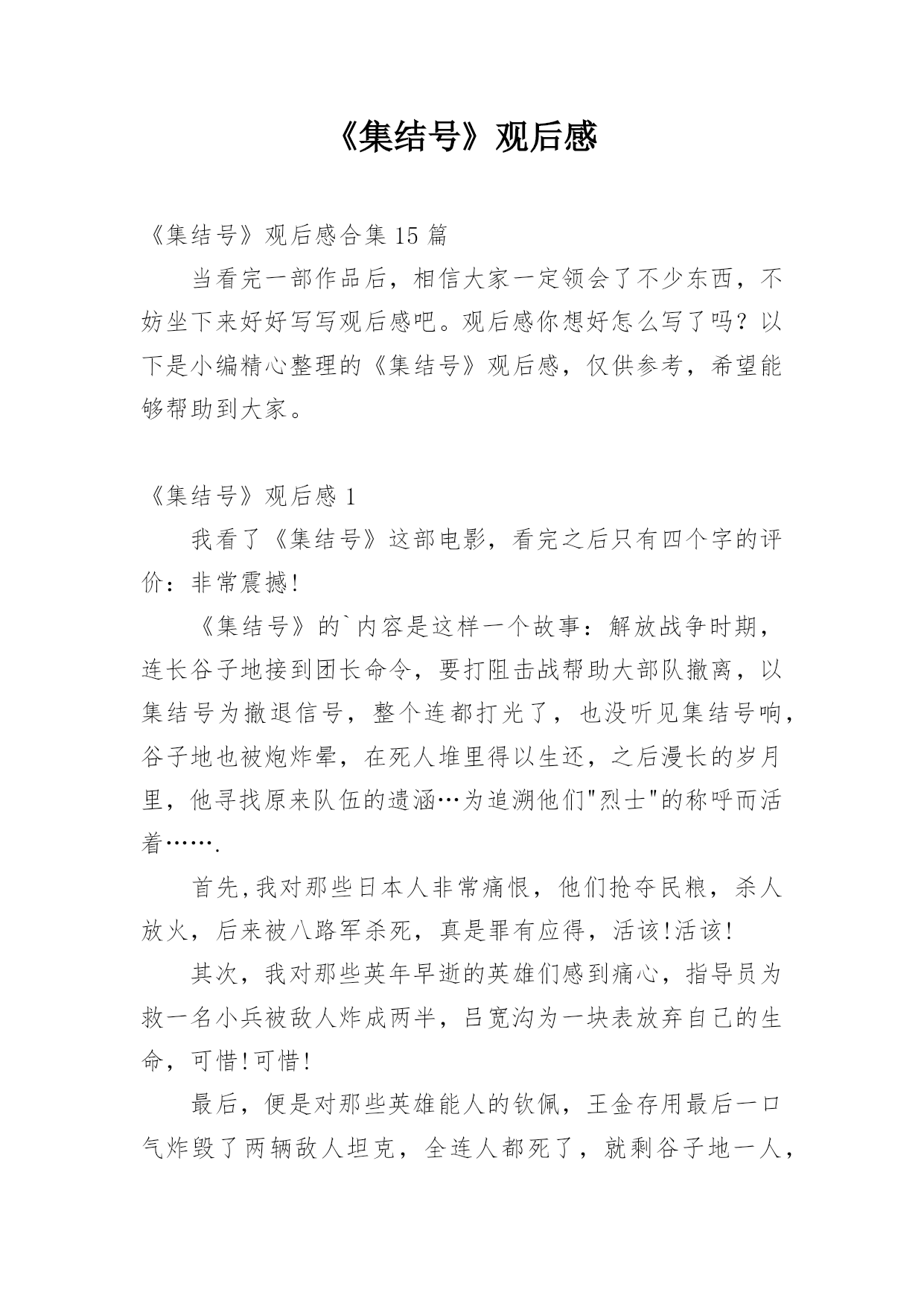 《集结号》观后感《集结号》观后感合集15篇当看完一部作品后,相信大家一定领会了不少东西,不妨坐下来好好写写观后感吧。观后感你想好怎么写了吗?以下是小编精心整理的《集结号》观后感,仅供参考,希望能够帮助到大家。《集结号》观后感1我看了《集结号》这部电影,看完之后只有四个字的评价:非常震撼!《集结号》的`内容是这样一个故事:解放战争时期,连长谷子地接到团长命令,要打阻击战帮助大部队撤离,以集结号为撤退信号,整个连都打光了,也没听见集结号响,谷子地也被炮炸晕,在死人堆里得以生还,之后漫长的岁月里,他寻找原来队伍
